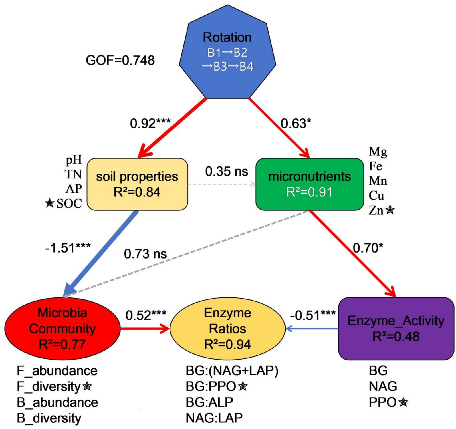 Figure 6. PLS-PM of microecological restoration mechanisms in the SR-OS2 rotation system, Solid red lines: Positive paths, Solid blue lines: Negative paths, Dashed lines: Non-significant paths, Numerical values: Path coefficients, ★: Strongest loadings, ***p < 0.001; *p < 0.05; ns p > 0.05, R2 indicates model explanatory power; GoF = 0.748; pH, potential of hydrogen; SOC, soil organic carbon; TN, total nitrogen; AP, available phosphorus; Fe, Iron; Mg, Magnesium; Mn, Manganese; Zn, Zinc; Cu, Copper; F_abundance, fungal abundance; F_diversity, fungal diversity; B_abundance, bacterial abundance; B_diversity, bacterial diversity; BG, β-glucosidase; NAG, N-acetylglucosaminidase; LAP, leucine aminopeptidase; PPO, polyphenol oxidase.