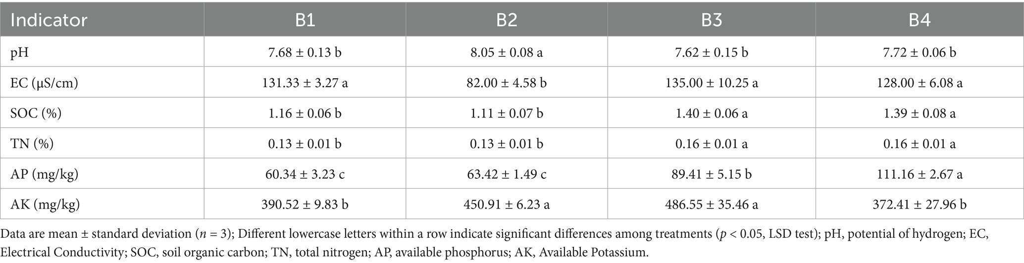 This study systematically investigated the effects of the SR-OS2 on the physicochemical properties of continuous cropping soil. The results (Table 1) demonstrated that the SMS application (B2) significantly increased soil pH and reduced EC, indicating a trend toward mitigating soil acidification and salinization, even though the initial pH was near neutral. A significant increase in soil pH of 0.57 units (p < 0.05) and a 37.56% reduction in EC. This improvement created a more favorable soil environment for subsequent crop growth. Regarding soil nutrients, after the first sunflower crop (B3), SOC and TN contents increased significantly by 20.6 and 23.0%, respectively, compared to the control (B1) (p < 0.05), while AP content increased significantly by 48.1% (p < 0.05). Following the harvest of the second sunflower crop (B4), SOC and TN contents remained at elevated levels, and AP content further increased to 111.16 mg/kg, representing a significant 84.2% increase over the control. These results indicate that the combination of SMS application and ornamental sunflower cultivation significantly promoted the accumulation of SOC and nitrogen, and enhanced phosphorus availability. Correlation analysis (Supplementary Table S1) revealed significant positive correlations between SOC and both TN (r = 0.66*) and AP (r = 0.70*), suggesting that increased SOC contributes to nitrogen and phosphorus accumulation. Concurrently, a highly significant negative correlation was observed between EC and pH (r = −0.87**), indicating that the SMS application effectively mitigated soil acidification by reducing EC.