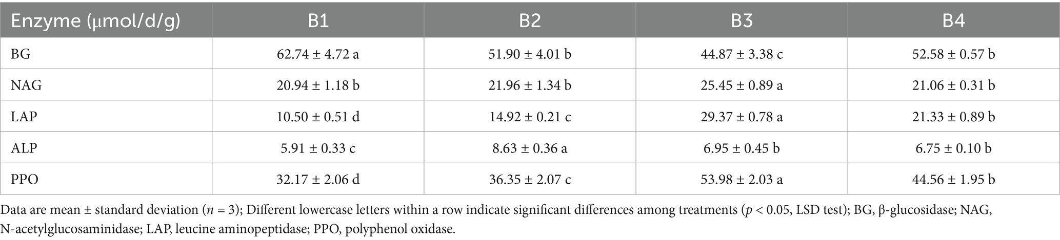 This study comprehensively analyzed the effects of the SR-OS2 on soil extracellular enzyme activities and their stoichiometric ratios. The results demonstrated significant treatment-dependent variations in soil enzyme activities. As shown in Table 2, the SMS application (B2) increased the activities of the nitrogen (N)-cycling enzyme LAP and phosphorus (P)-cycling enzyme ALP by 42.1 and 46.0%, respectively (p < 0.05), while reducing BG activity (C-cycling) by 17.2% (p < 0.05). This shift indicates enhanced microbial demand for N and P acquisition following SMS amendment. After sunflower cultivation (B3), PPO activity peaked at 67.8% above the control (B1) (p < 0.05), suggesting accelerated plant residue decomposition. By the second crop (B4), LAP activity further increased by 103.1% compared to B1, whereas NAG activity remained unchanged. This reflects persistent N-cycling enhancement, potentially constrained by fungal metabolism, since NAG is primarily fungal-derived, while LAP is bacterial-dominated (Xing et al., 2024).