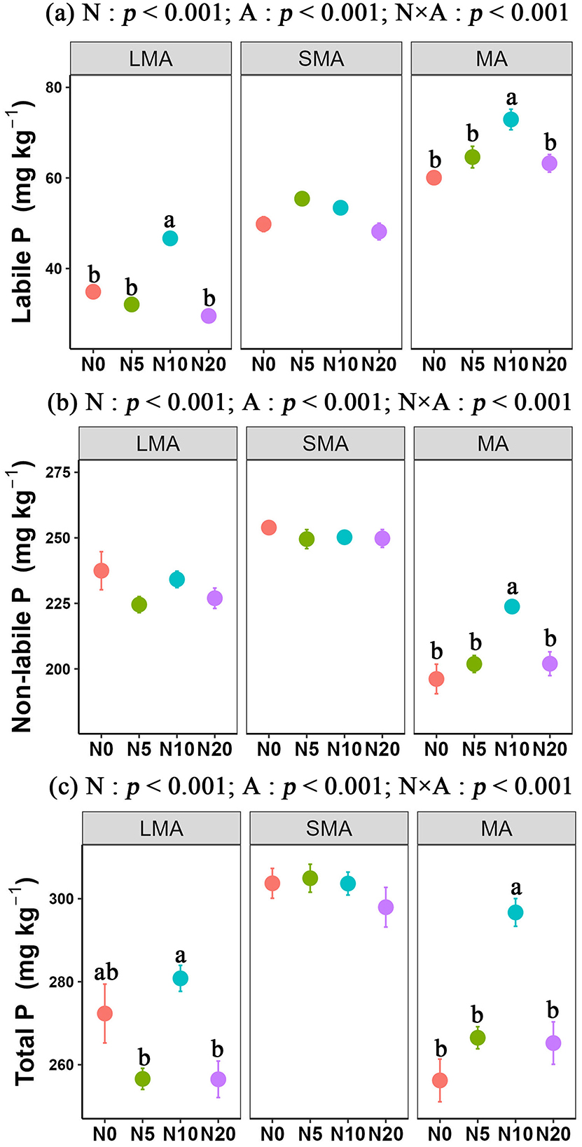 Figure 1. Responses of soil P fractions to N addition at three aggregate-size. The statistical results are two-way ANOVA testing for effects of N addition (N) and aggregate (A). Different lower-case letters indicate significant differences (one-way ANOVA, LSD's HSD, p < 0.05) among N addition in the same aggregate. Large microaggregates (LMA, >2 mm), Small microaggregates (SMA, 0.252 mm) and microaggregates (MA, <0.25 mm). Labile P (i.e., resin-P, NaHCO3-Pi, NaHCO3-Po, NaOH-Pi, NaOH-Po), Non-Labile P (i.e., NaOHus-Pi, NaOHus-Po, HCl-Pi, HCl-Po).