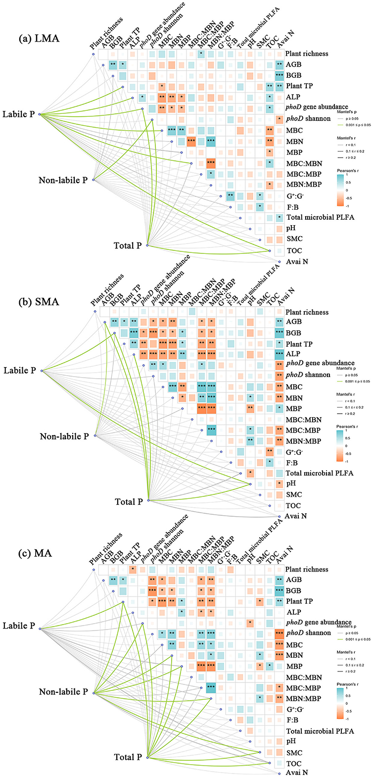In the context of LMA, significant correlations were found between soil labile P and plant total P, phoD gene abundance, as well as organic C. Conversely, the Shannon index of phoD genes showed a significant association with soil non-labile P. Total P exhibited correlations with phoD gene abundance, phoD Shannon diversity, and soil organic C (Figure 2a). In SMA, soil labile P and non-labile P and total P were significantly correlated with all measured influencing factors (Figure 2b). Plant, soil, and microbial properties exerted a more dominant influence on P fractions in MA, demonstrating significantly stronger relationships than those observed in LMA. Specifically, soil labile P demonstrated significant correlations with ALP activity, MBP, MBC:MBP, and MBC:MBN, whereas soil non-labile P was linked to plant total P, phoD gene abundance, MBC, MBN, MBP, MBN:MBP, and SMC (Figure 2c).