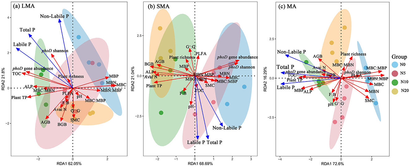 N addition had distinct effects on soil microbial biomass, functional diversity, and stoichiometry among soil aggregate fractions. In LMA and SMA, soil MBC and MBN exhibited a biphasic response to increasing N inputs, decreasing initially before recovering, although MBN failed to rebound in both fractions (Supplementary Figures S3a, b). Soil MBP was only significantly promoted at the highest N level (N20) in LMA and SMA (Supplementary Figure S3c). Concurrently, soil phoD Shannon diversity, phoD gene abundance, and F:B ratio declined consistently in LMA and SMA (Supplementary Figures S5b, c, S6a). Stoichiometric ratios reflected altered nutrient demand: MBN:MBP and MBC:MBP decreased (Supplementary Figures S4a, b), while MBC:MBN increased (Supplementary Figure S4c), indicating a shift toward C limitation with enhanced P demand. In MA, all N addition levels promoted MBP accumulation, with the strongest response at N20 level (Supplementary Figure S3c). MBC and MBN followed the same decline-then-recovery pattern as other fractions but with more pronounced fluctuations (Supplementary Figures S3a, b). Notably, MA exhibited contrasting microbial community shifts: F:B ratio and phoD gene abundance increased with N addition (Supplementary Figures S5b, S6a), suggesting a dominance of fungi and functional bacteria. N addition enhanced ALP activity and PLFAs in all aggregates (Supplementary Figures S5a, S6c).