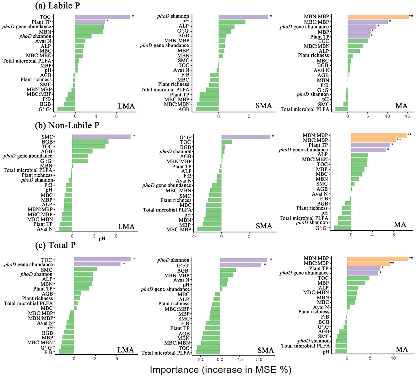 Figure 4. Results of mean square error (MSE, %) from a Random Forest aiming to identify the main driver of soil labile P, non-labile P and total P. Plant TP, plant total P; AGB, plant aboveground plant biomass; BGB, plant belowground plant biomass; TOC, total organic carbon; Avai N, available N; SMC, soil moisture content; phoD Shannon, soil phoD shannon diversity, phoD gene abundance, soil phoD gene abundance; MBC:MBP, ratio of microbial biomass carbon to microbial biomass P; MBN:MBP, ratio of microbial biomass N to microbial biomass P; MBC:MBN, ratio of microbial biomass carbon to microbial biomass N; ALP, alkaline phosphatase activity; MBP, microbial biomass P; MBC, microbial biomass carbon; MBN, microbial biomass N; F:B ratio, the ratio of fungi biomass to bacteria biomass. “*”, “**”, and “***” represent significance at P < 0.05, P < 0.01, and P < 0.001, respectively.