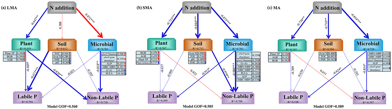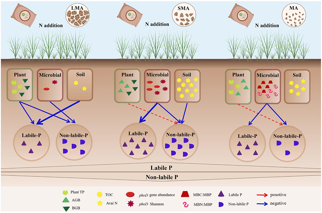 Our results of PLS-PM delineated direct and indirect pathways influencing P fractions (Figures 5a–c, 6). In LMA, soil labile P was directly regulated by soil properties and plant traits, while soil non-labile P responded to plant and microbial factors. Both pathways were indirectly mediated by N addition (Figures 5a, 6). In SMA, soil labile P was directly controlled by soil microbes, whereas soil non-labile P was driven by soil and microbial properties. N addition, indirectly affected both fractions through microbial community shifts (Figure 5b). In MA, microbial properties directly governed both soil labile P and non-labile P, with N addition indirectly modulating P dynamics via soil microbial stoichiometry (Figures 5c, 6).