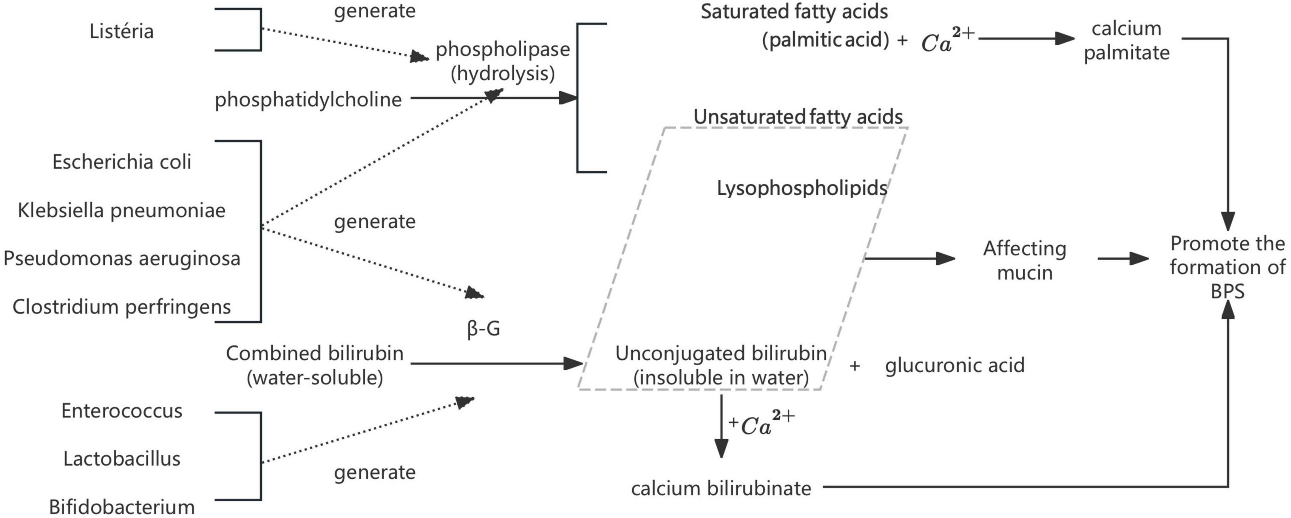 Escherichia coli (E. coli). Bacterial infection has long been recognized as a key contributor to pigment gallstone pathogenesis. As early as 1966, Japanese researcher Maki (Maki, 1966) proposed the seminal hypothesis that E. coli participates in calcium bilirubinate stones through the production of β-glucuronidase (β-G) and phospholipases (PLs). Subsequent studies confirmed that β-G hydrolyze conjugated bilirubin (CB) into unconjugated bilirubin (UCB), which readily binds to Ca2+ to form insoluble calcium bilirubinate (Nakano et al., 1988). Meanwhile, bacterial PLs degrade phosphatidylcholine (PC) into palmitic acid and lysolecithin: the former precipitates with Ca2+ to form calcium palmitate, while the latter interacts with mucin and bilirubin to promote calcium phosphate crystallization (Hattori et al., 2000). Both processes act synergistically to drive brown pigment stones development (Xiao et al., 2021; Figure 1). These findings collectively highlight the mechanistic role of bacterial enzymes in modulating bile composition and initiating stone nucleation, which has been validated in vitro by Higashijima et al. (1996) and Leung et al. (2001). Xiao et al. (2021) further proposed that other common biliary bacteria [e.g., Enterococcus, Clostridium perfringens (C. perfringens), and Pseudomonas aeruginosa (P. aeruginosa)] can also produce β-G, thereby contributing to GSD. These species will be listed in subsequent sections without further elaboration. Recent studies have corroborated these findings, identifying E. coli and other biliary bacteria as significant contributors to gallstone formation through their enzymatic activities and biofilm formation capabilities (Muturi et al., 2024; Tan et al., 2025; Zhang et al., 2025).