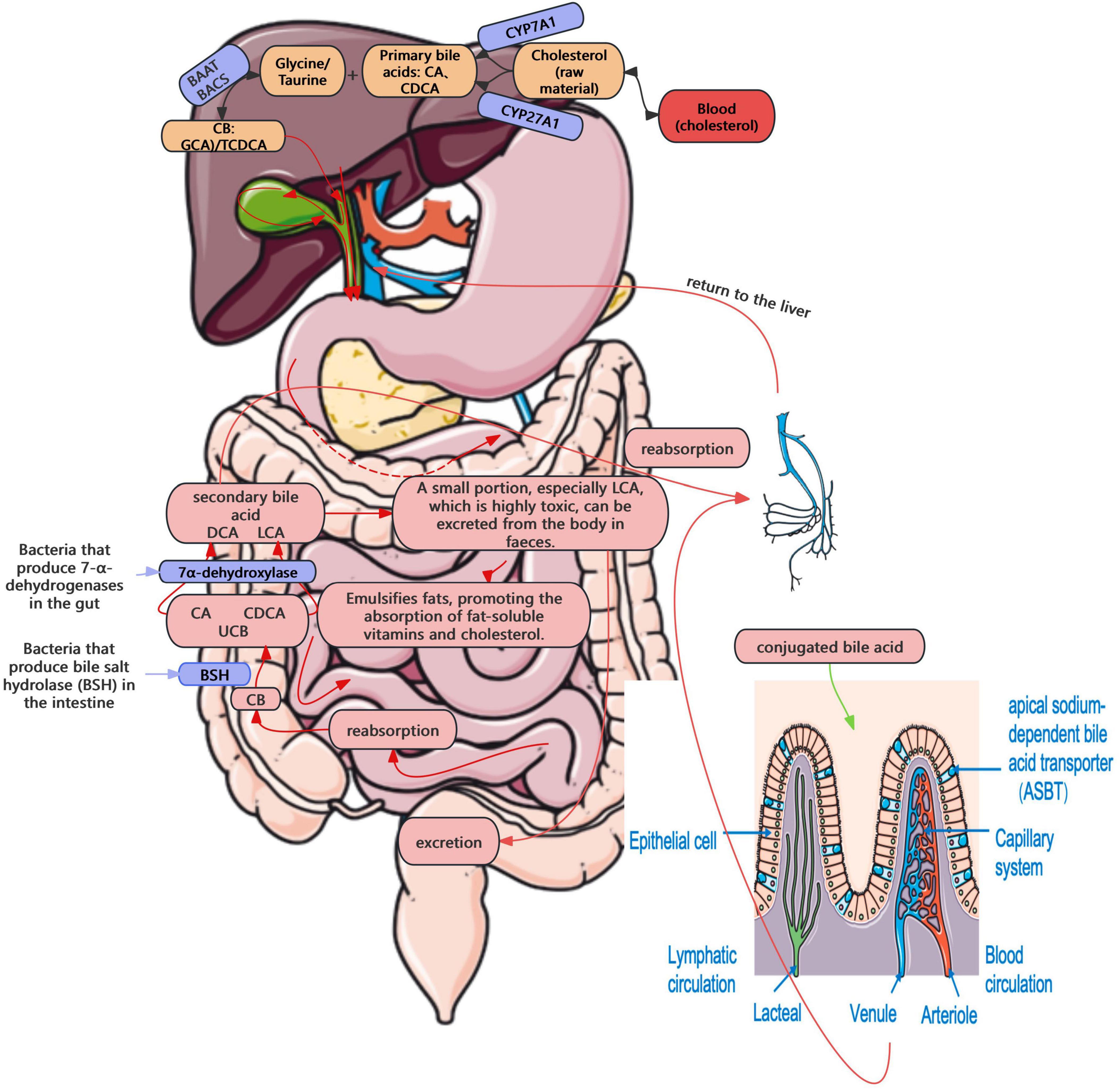 The enterohepatic circulation of bile acids plays a central role in cholesterol homeostasis and GSD pathogenesis (Cai and Chen, 2014). In this process, cholesterol is converted into primary bile acids, e.g., and chenodeoxycholic acid (CDCA), conjugated, secreted into bile, and recycled via intestinal reabsorption and hepatic uptake—functions tightly regulated by enzymes, including CYP7A1 and sterol 27-hydroxylase (CYP27A1), and transporters, including bile salt export pump (BSEP), apical sodium-dependent bile acid transporter (ASBT), and sodium-taurocholate cotransporting polypeptide (NTCP) (Cai and Chen, 2014). A small portion of bile acids that are not reabsorbed reach the colon, where they are deconjugated by gut bacteria expressing BSH, producing free bile acids (Wise and Cummings, 2022). Subsequently, they are converted by 7α-dehydroxylase into secondary bile acids, such as deoxycholic acid (DCA) and lithocholic acid (LCA) (Wise and Cummings, 2022). While some of these are reabsorbed into the portal system, others, particularly the more toxic LCA, are excreted in feces (Wise and Cummings, 2022). This enterohepatic circulation occurs 6–10 times per day, with a recycling efficiency of over 95% (Roberts et al., 2002; Figure 2). Enterohepatic circulation becomes disrupted in the presence of gut microbiota dysbiosis. A recent study also demonstrated that intestinal flora imbalance significantly affects bile acid metabolism, contributing to gallstone formation (Wang et al., 2020; Zhao et al., 2023). Elevated BSH activity may interfere with bile acid reabsorption, resulting in decreased bile salt concentration, reduced cholesterol solubility, and ultimately, the precipitation of cholesterol crystals, leading to the formation of GSD.