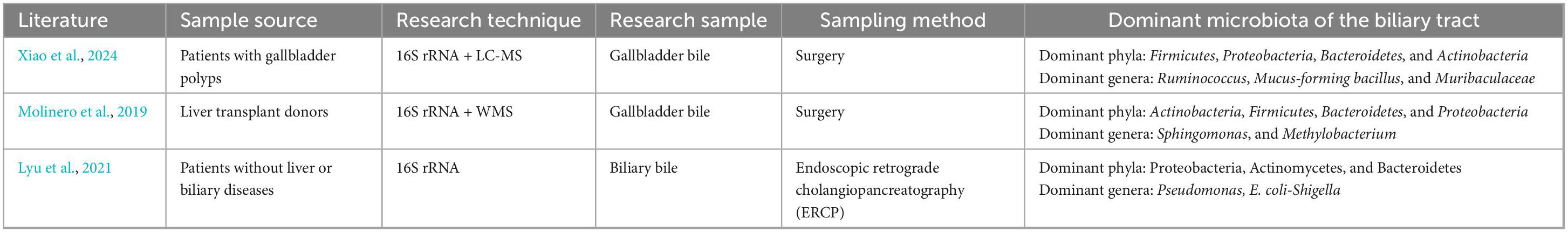 Given the ethical and practical limitations of sampling bile from healthy individuals, many studies have adopted alternative approaches. Specifically, bile samples from patients with non-inflammatory gallbladder polyps or from liver transplant donors without hepatobiliary disease are commonly utilized as surrogate controls, providing the closest possible representation of normal biliary microbiota and composition. Higashi et al. (2022) demonstrated the reflux of bile from the bile ducts into the gallbladder. With the use of cine-dynamic magnetic resonance cholangiopancreatography with a spatially selective inversion-recovery pulse, Ito et al. (2014) reported that retrograde bile movement occurred as a physiologic phenomenon in healthy controls, which was found in 74% (26 out of 35) of the nondilated group. Accordingly, we hypothesize that the biliary microbiota encompasses microbial communities residing in the gallbladder as well as in the intrahepatic and extrahepatic bile ducts. Phylum-level analysis using 16S rRNA gene sequencing or metagenomic provides a broad overview of microbial composition and trends. In contrast, genus-level composition and diversity typically indicate the specific microenvironmental conditions of individual anatomical niches (Gwak and Rho, 2020). Therefore, our research continued to carry out statistical analyses of bacterial community composition at both the phylum and genus levels across all included studies.