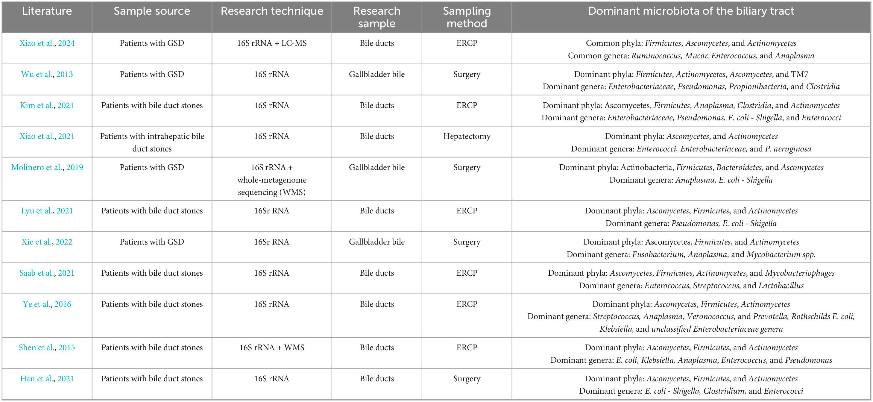 Molinero et al. (2019) analyzed gallbladder bile samples from 13 liver transplant donors without hepatobiliary disease and 14 patients with GSD using 16S rRNA gene sequencing. They found that the dominant phyla in healthy donors were Actinobacteria, Firmicutes, Bacteroidetes, and Proteobacteria, while major genera included Sphingomonas and Methylobacterium (Molinero et al., 2019). This study provided baseline evidence that the biliary tract may harbor a resident microbiota in healthy controls, laying the groundwork for the identification of GSD-associated dysbiosis patterns (Molinero et al., 2019). Xiao et al. (2024) pioneered the integration of 16S rRNA gene sequencing and LC–MS–based metabolomics in comparing patients with asymptomatic gallbladder polyps and those with common bile duct (CBD) stones. Consequently, polyp patients exhibited a microbiota composition similar to healthy controls, while stone patients showed decreased Actinobacteria, increased Proteobacteria, and elevated Enterococcus abundance, implying a possible synergy between microbial and metabolic alterations in GSD pathogenesis (Xiao et al., 2024). Similarly, Wu et al. (2013) reported comparable findings in 29 Chinese patients with GSD, identifying six core bacterial phyla—primarily Actinobacteria, Bacteroidetes, Firmicutes, and Proteobacteria—and noting Bacteroides as the most abundant genus. This study offered important population-based evidence and facilitated the clarification of conserved microbial signatures across individuals with GSD (Wu et al., 2013). In another study on biliary obstruction, Kim et al. (2021) documented significantly increased Enterococcus levels in the bile of patients with brown pigment stones compared to those with non-stone obstructions. Moreover, patients with GSD may also exhibit significantly reduced biliary microbial diversity compared to individuals without hepatobiliary disorders. Xiao et al. (2021) reported significantly reduced microbiota diversity in the bile of patients with intrahepatic bile duct stones. Similarly, Molinero et al. (2019) observed markedly lower microbiota diversity in patients with GSD compared to liver transplant donors without hepatobiliary disease. Consistently, Xiao et al. (2024) also observed significantly reduced microbial richness, diversity, and evenness in subjects with bile duct stones compared to the control (patients with gallbladder polyps).