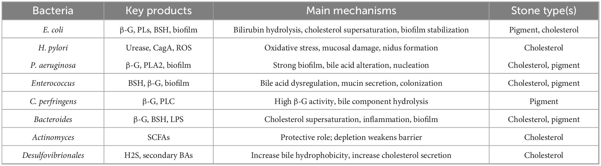 Gallstone disease can be classified into cholesterol gallstones and pigment stones, with the latter further divided into black pigment stones and brown pigment stones (Kumar et al., 2021). The formation of cholesterol gallstones is primarily attributed to bile composition imbalances—particularly cholesterol supersaturation—gallbladder dysmotility, and accelerated nucleation (Wang K. et al., 2025). In contrast, pigment stones are generally associated with hemolytic anemia, liver cirrhosis, and biliary tract infections (Lysandra et al., 2022). Traditionally, cholesterol gallstones were regarded as a consequence of metabolic disturbances. However, emerging evidence suggests that alterations in the biliary microbiota may also contribute to their development (Binda et al., 2022). Historically, the role of biliary bacteria has received little attention in GSD formation. Nevertheless, a potentially active role for microorganisms in GSD pathogenesis has been underscored by the frequent detection of bacteria in the biliary tract, with the rapid advancement of high-throughput sequencing and metagenomic technologies. Notably, specific bacterial taxa and their secreted products not only gain a colonization advantage within the biliary environment but also modulate bile composition, promote crystal nucleation, facilitate biofilm formation, and trigger local inflammation (Liu et al., 2025). Together, these mechanisms collectively drive gallstone formation. Our subsequent discussion will focus on the roles and mechanisms of major biliary bacterial phyla and representative genera in the pathogenesis of GSD. To provide a concise synthesis, we summarized the main bacteria, their key products, mechanisms, and related stone types in Table 3. This table complements the detailed descriptions in the text and improves readability.
