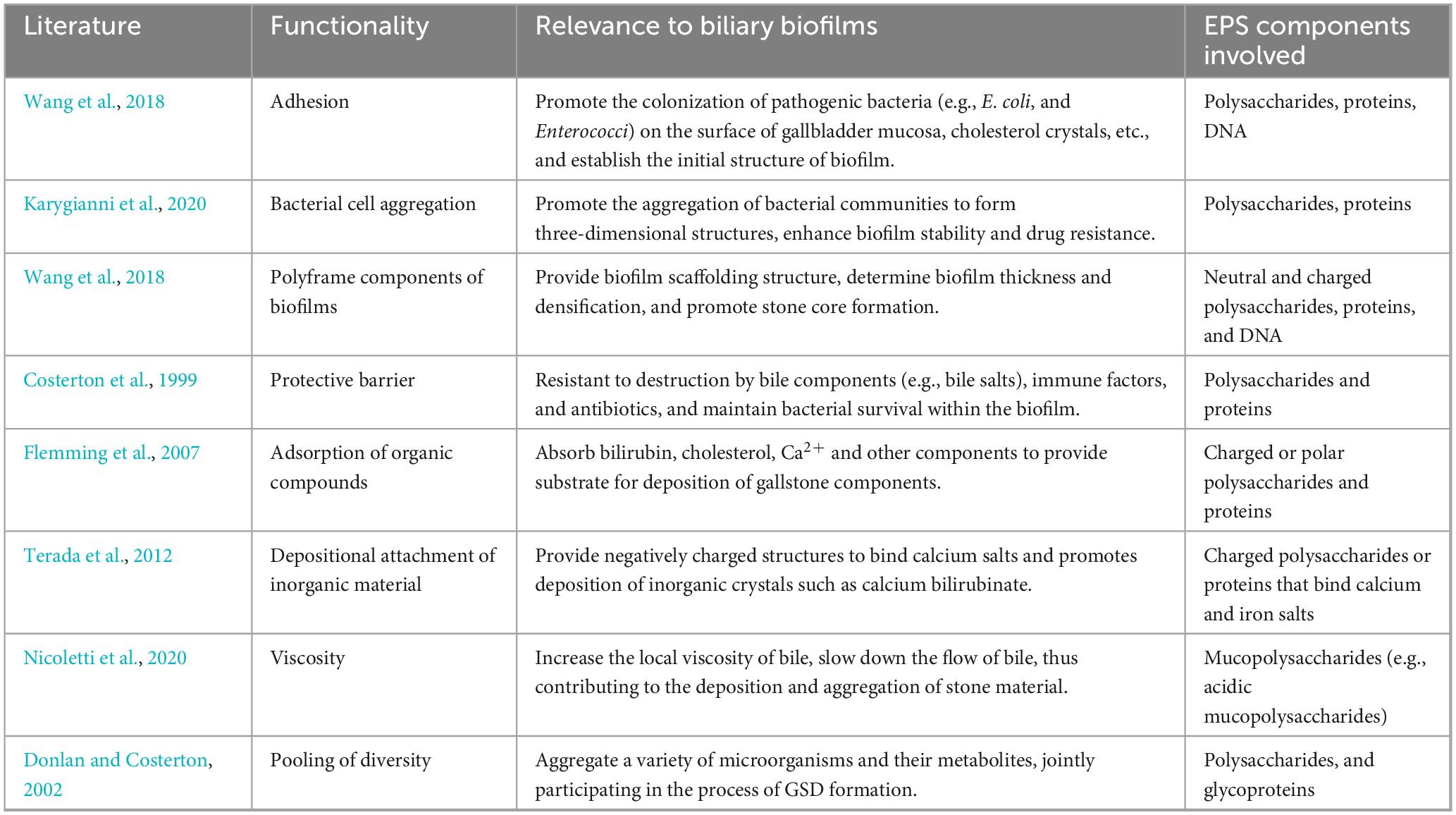 As summarized in Table 4, biofilms and their extracellular matrix play multifaceted roles in GSD pathogenesis, manifesting in the initiation of stone nucleation, and sustenance of bacterial survival within an inflamed biliary environment. Importantly, it is not merely the presence of biofilms but the pathological remodeling of their EPS components, particularly under dysbiotic or inflammatory stimuli, ultimately driving the transition from colonization to lithogenesis. The accumulation of charged polysaccharides, proteins, and DNA within the biofilm matrix may enhance bacterial adhesion, resist bile salt-mediated degradation, and enhance the aggregation and retention of lithogenic substrates (Costerton et al., 1999; Donlan and Costerton, 2002; Flemming et al., 2007; Karygianni et al., 2020; Nicoletti et al., 2020; Terada et al., 2012; Wang et al., 2018). These structural and biochemical features of EPS-enriched biofilms may contribute to the formation of GSD, persistence, and recurrence, thus implicating biofilm modulation as a potential target for therapeutic intervention. In addition to P. aeruginosa, bacterial genera such as E. coli, Klebsiella pneumoniae, Enterococcus, C. perfringens, Bacteroides, and Acinetobacter are also contributors of biofilm formation in the biliary tract, exhibiting intimate associations with GSD development (Grigor’eva and Romanova, 2020).