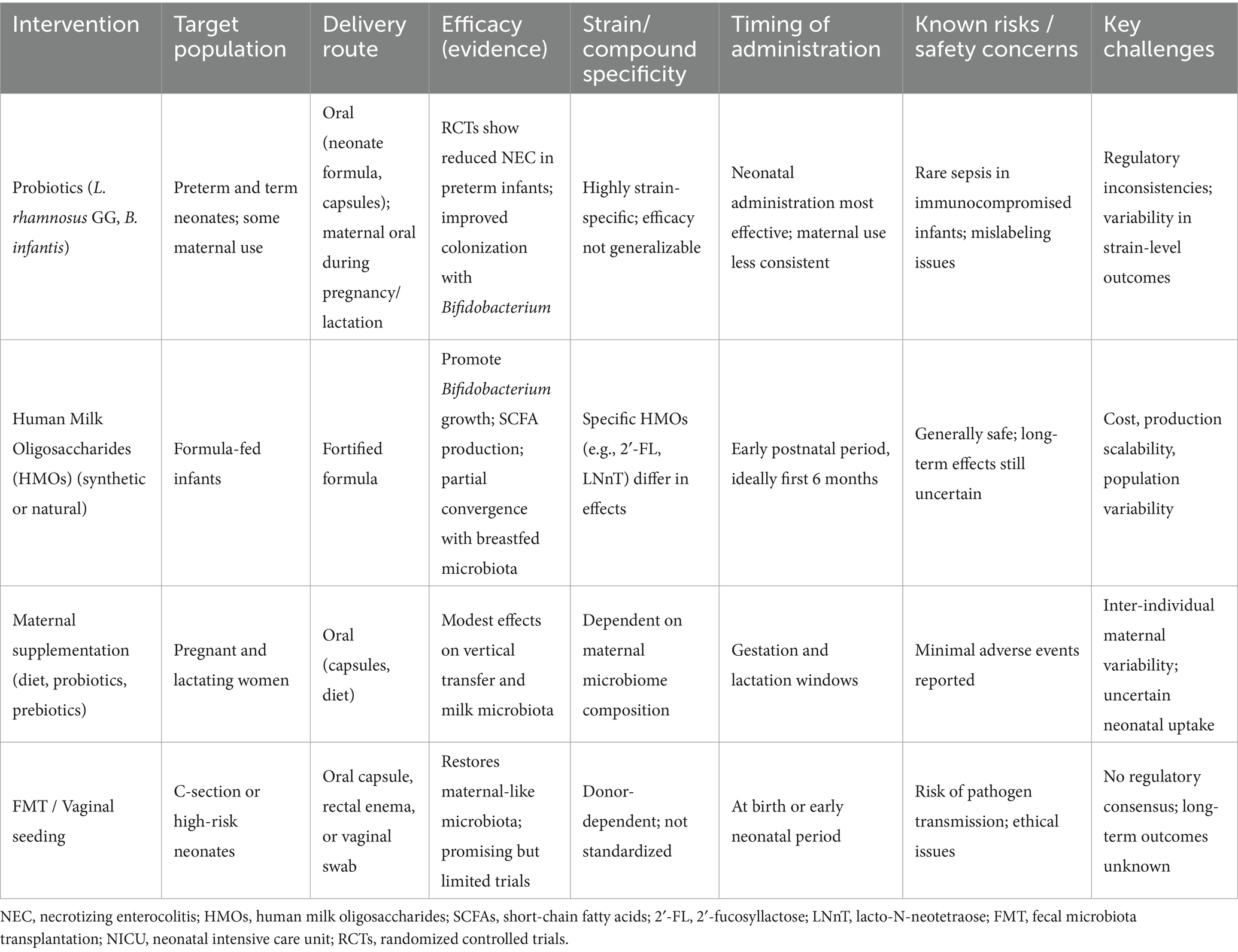 Despite encouraging evidence, several barriers limit widespread clinical adoption. First, strain-level variability is a critical determinant of efficacy: probiotic benefits are not universal, and even within HMOs, individual compounds exert distinct effects (Beck et al., 2022; Neu and Stewart, 2025; Boudry et al., 2021; Bakshi et al., 2023). Second, regulatory oversight lags behind practice. Probiotics are often marketed as food supplements without standardized quality controls, while FMT and vaginal seeding remain under strict scrutiny (Iqbal et al., 2023; Mills et al., 2025; Zeng et al., 2025). Third, long-term tracking is scarce. Few studies follow infants beyond early childhood, leaving uncertain whether interventions confer durable immunological, metabolic, or neurodevelopmental benefits (Wilmanski et al., 2021, 2022). Finally, implementation challenges, including differences in NICU protocols, maternal diets, breastfeeding prevalence, and antibiotic use, underscore the need for context-specific strategies (Buffet-Bataillon et al., 2021; Selma-Royo et al., 2024). Addressing these issues through harmonized guidelines, long-term cohort studies, and precision intervention design will be crucial for safe and effective translation.