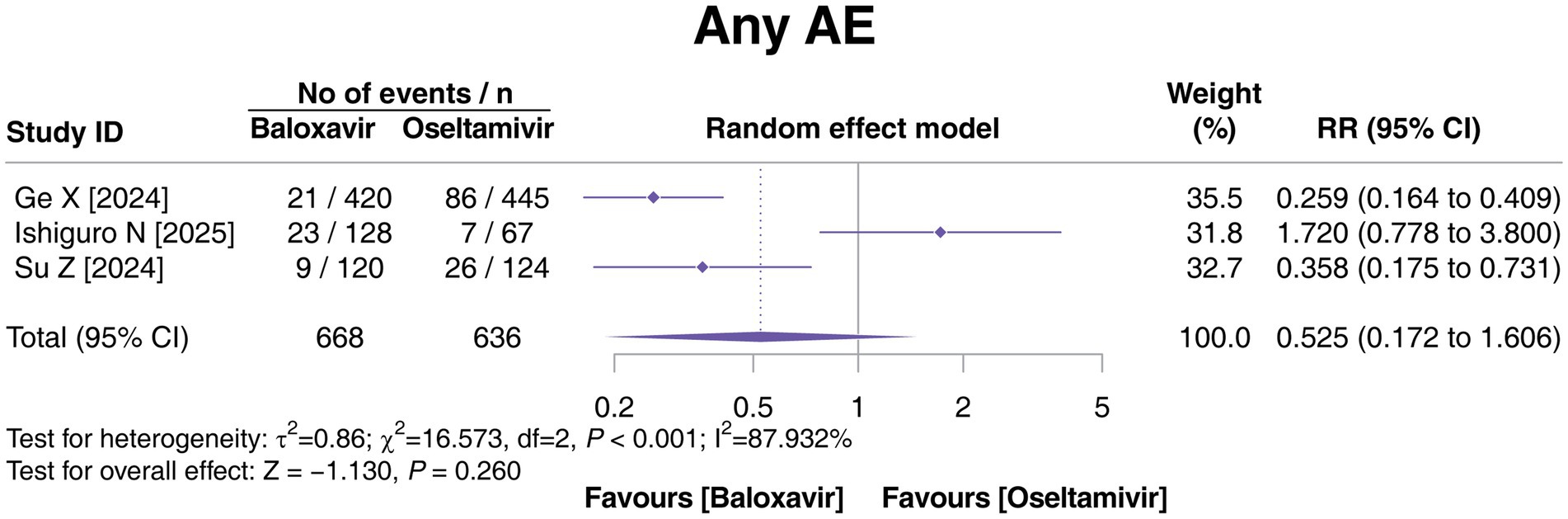 Three studies reported AEs, and there was heterogeneity among these three studies (p < 0.001, I2 = 87.932%). The incidence of any AE was not different between the baloxavir and oseltamivir groups (p = 0.260, Figure 4).
