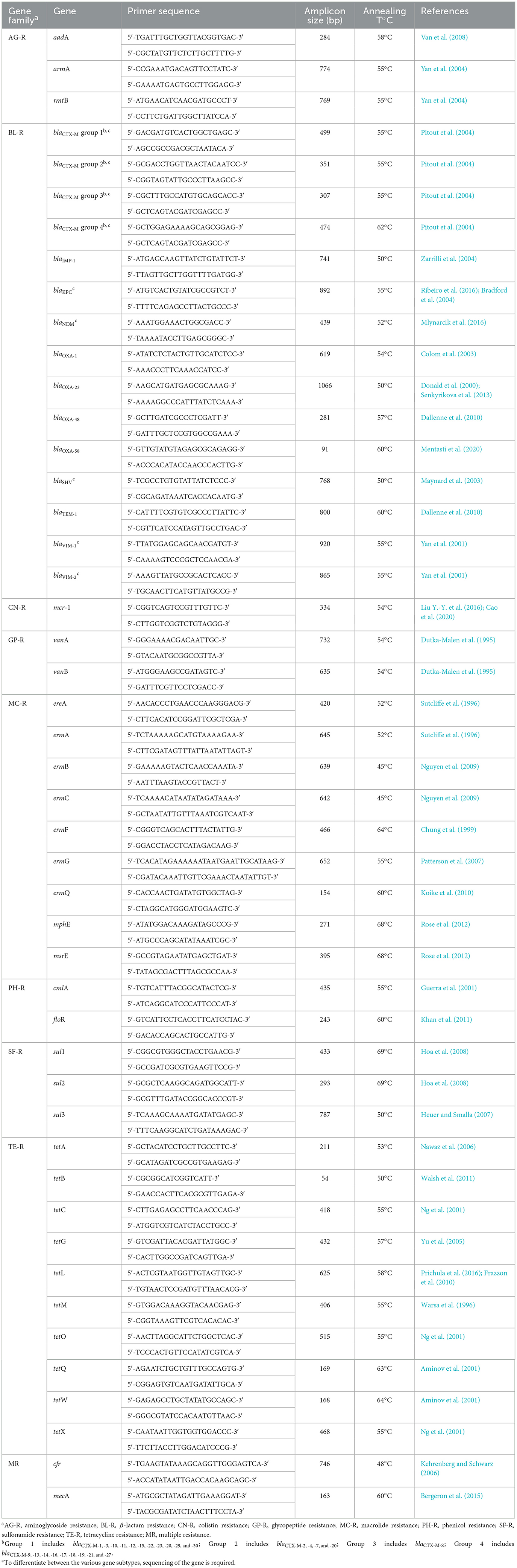 As a resource for the scientific community, we assembled in Table 1 a consolidated set of validated primer sequences for the most frequently reported ARGs (Zhuang et al., 2021). These genes were selected based on their high prevalence, and the primer pairs were taken from the original design publications, prioritizing those most widely adopted in subsequent studies. By integrating scattered information from diverse studies into a single curated reference, this table is intended to facilitate assay design and promote standardized approaches to ARG detection across clinical, environmental, and research contexts.
