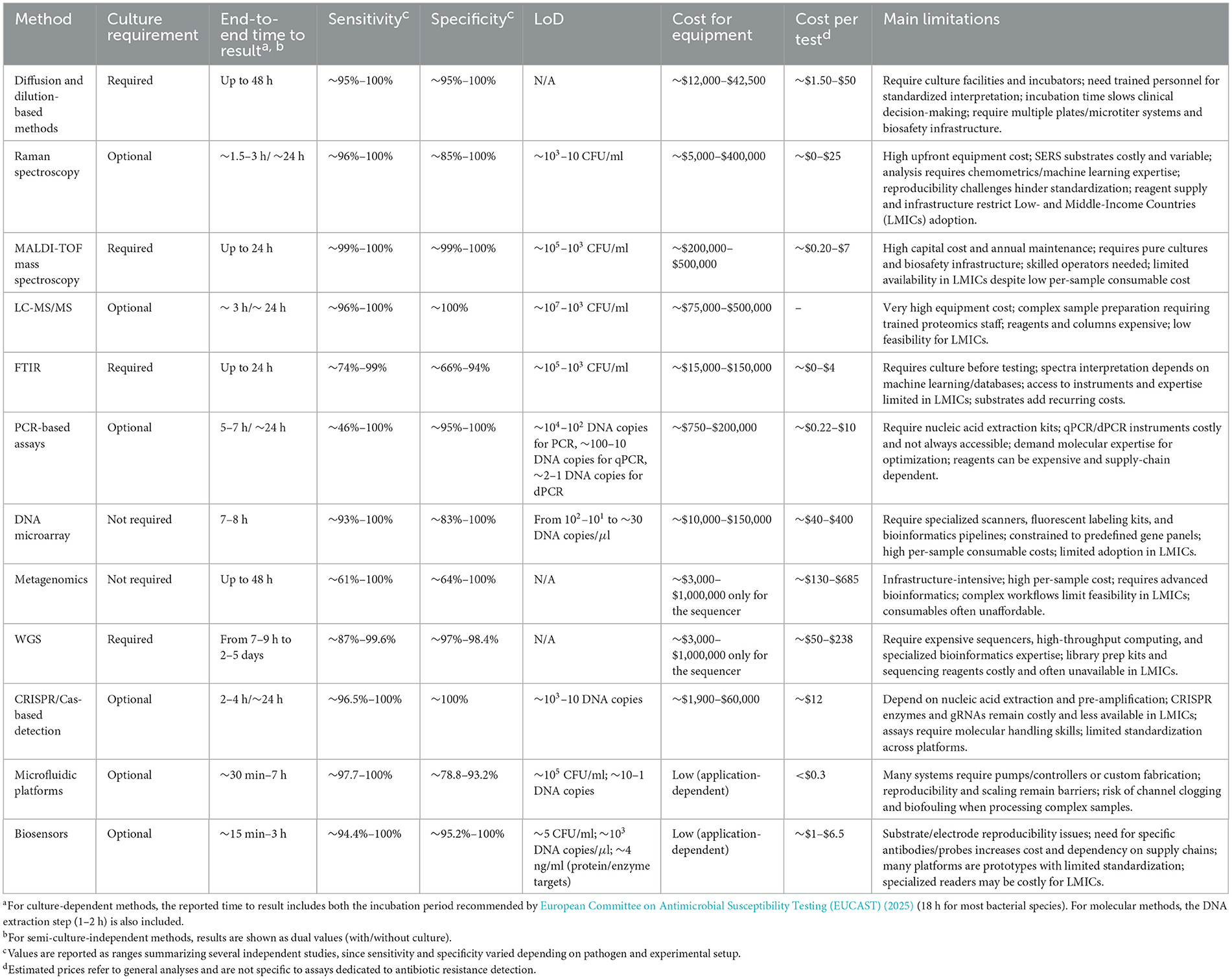 Given this background, effective detection and monitoring are crucial. In this review, we provide a broad, narrative synthesis of methods for detecting antibiotic resistance, from classical culture-based approaches to advanced molecular and computational techniques (Figure 1). Several reviews have addressed different aspects of resistance detection, including molecular techniques, agroecosystem surveillance, and rapid point-of-care assays (Elbehiry et al., 2025; Yamin et al., 2023; Kaprou et al., 2021; Dietvorst et al., 2020; Anjum et al., 2018; March-Rosselló, 2017; Luby et al., 2016; McLain et al., 2016; Aarts et al., 2005; Sundsfjord et al., 2004; Tan, 2003). Building on these contributions, the present review provides an integrated perspective on phenotypic, molecular, spectroscopic, biosensing, microfluidic, and AI-enhanced approaches. We emphasize diagnostic performance, workflow considerations, and feasibility in resource-limited settings, supported by a comparative synthesis of sensitivity, specificity, turnaround time, and costs, along with a curated list of validated primers for high-priority resistance genes. Taken together, this framework is intended to guide both research and clinical applications by clarifying the comparative strengths, limitations, and future potential of current detection strategies.