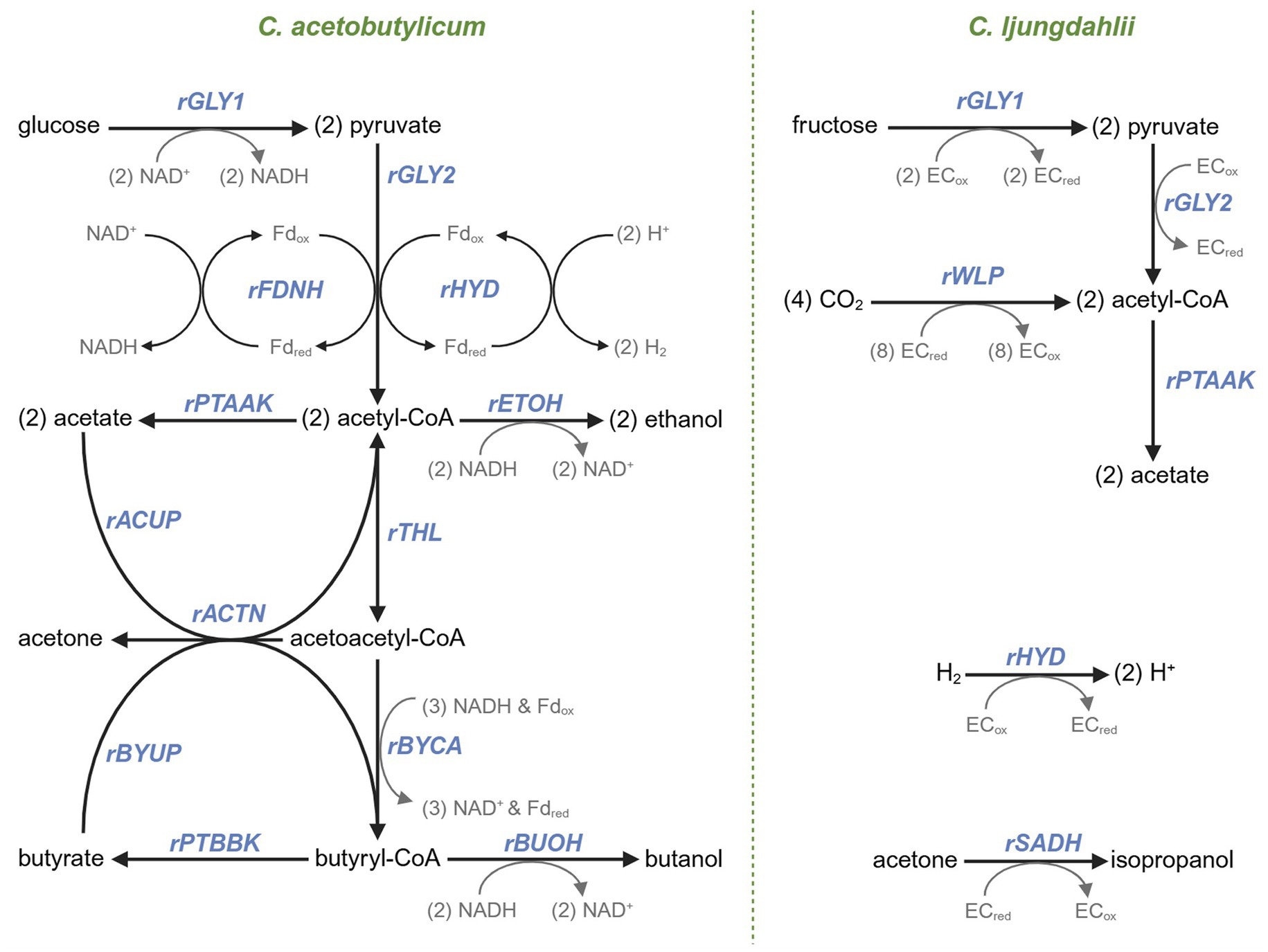 Figure 1. A metabolic map and associated fluxes of the primary metabolism of Cac (left) and Clj (right). In Cac, glycolysis catabolizes glucose to pyruvate (the rGLY1 flux). Pyruvate decarboxylation (rGLY2) forms acetyl-CoA, with electrons being conserved by forming (rFDNH flux) reduced ferredoxin (Fdred) which facilitates the conversion of protons to H2 (rHYD). Acetate (rPTAAK) and ethanol (rETOH) are produced from acetyl-CoA. The thiolase responsible for rTHL flux that catalyzes the formation of acetoacetyl-CoA from acetyl-CoA is expressed from the corresponding chromosomal gene (thl) and also from the copies of the same gene on the p95ace02a plasmid. Acetate (rACUP) and butyrate (rBYUP) reuptake via the CoA transferase is coupled to acetone formation (rACTN) from acetoacetyl-CoA. The three enzymatic step conversion of acetoacetyl-CoA to butyryl-CoA corresponds to the rBYCA flux. From butyryl-CoA, butyrate production is carried by the rPTBBK flux, and butanol production by the rBUOH flux. In Clj, fructose is catabolized to acetyl-CoA through the corresponding rGLY1 and rGLY2 fluxes. Acetyl-CoA is synthesized by the WLP pathway (the rWLP flux) from CO2. Acetate is synthesized through the rPTAAK pathway. Clj takes up (rHYD) H2 through its hydrogenase system and converts acetone to isopropanol (rSADH) using a secondary dehydrogenase. A non-specific electron carrier (‘EC’) is used in the Clj reactions because either several electron carriers exist or the electron carriers are not confidently known.