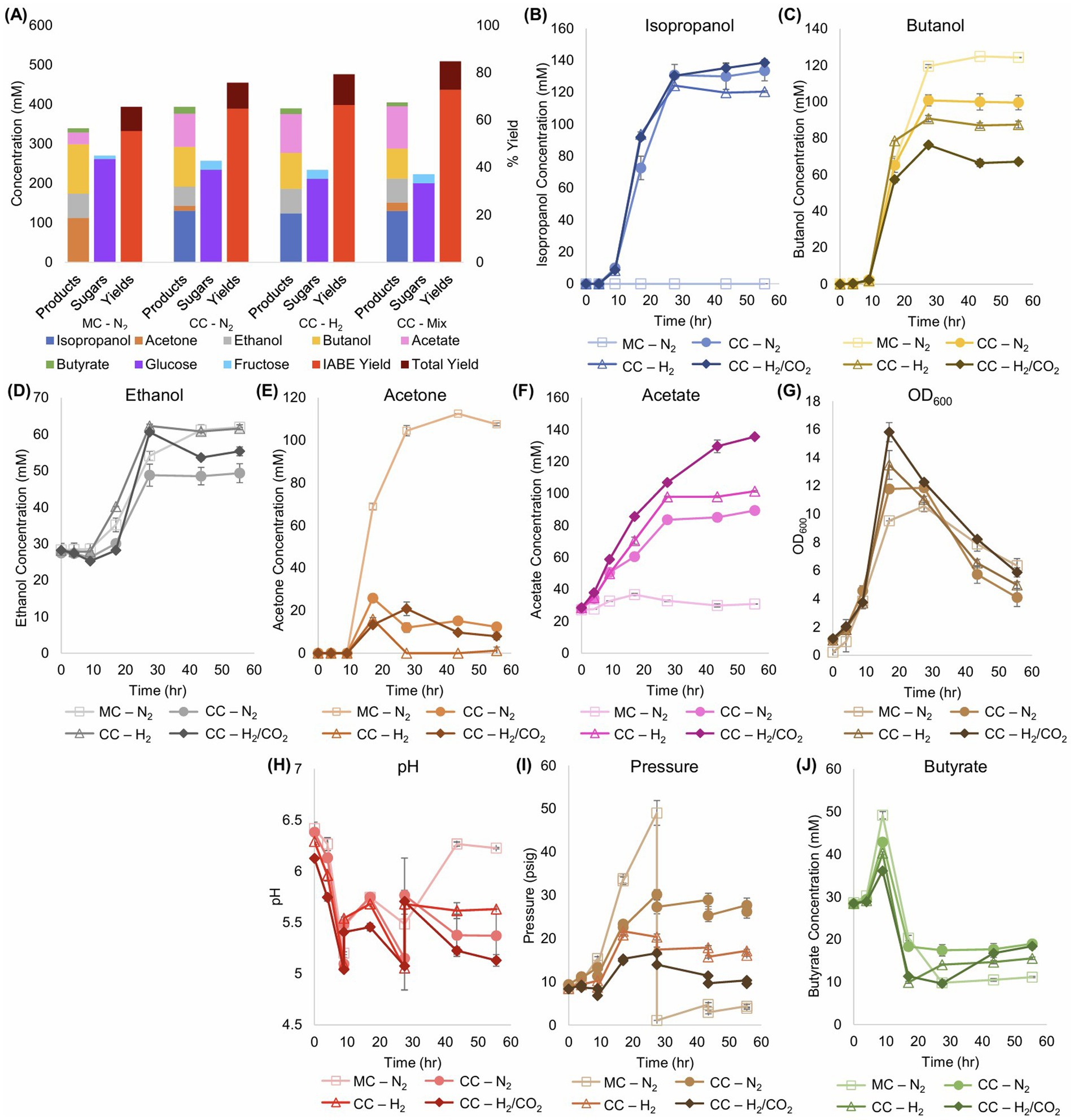 Figure 2. Metabolite production, sugar consumption, and metabolite yields of Cac and Clj cocultures in sealed serum bottles with different headspace gas composition: N2, H2 or Mix [H2/CO2 (80/20)]. MC refers to monocultures and CC refers to cocultures. (A) Summary of product concentrations, sugar consumption, and metabolite yields of the cocultures. The IABE yield refers to IPA, BuOH, EtOH, and acetone. The total yield also includes butyrate and acetate. In all cases, the coculture yields surpassed the monoculture yields, primarily through the production of higher combined concentrations of acetone and IPA versus acetone alone in the monoculture, and through the production of additional acetate. (B) Kinetic profile of IPA formation. The monoculture produces no IPA. (C) Kinetic profile of BuOH formation. The monoculture produced a statistically significantly higher amount of BuOH than any coculture. (D) Kinetic profile of EtOH formation. (E) Kinetic profile of acetone formation. In the cocultures, acetone accumulation is typically less than 20 mM. (F) Kinetic profile of acetate formation. In contrast to the CO2-containing cocultures, the monoculture produced barely any acetate. (G) Biomass (OD600) formation kinetics. The cocultures reached the highest peak OD600. (H) The pH kinetic profile. The pH of the bottles was manually adjusted at 9 and 28 h. (I) The pressure, in psig, of the sealed serum bottles. The monoculture bottles were bled of excess pressure at 28 h to avoid explosion. H2-containing cocultures (including the mixed H2/CO2 gas) displayed the lowest unadjusted gas headspace levels, thus demonstrating the consumption of both gas components. (J) Kinetic profile of butyrate formation and consumption.
