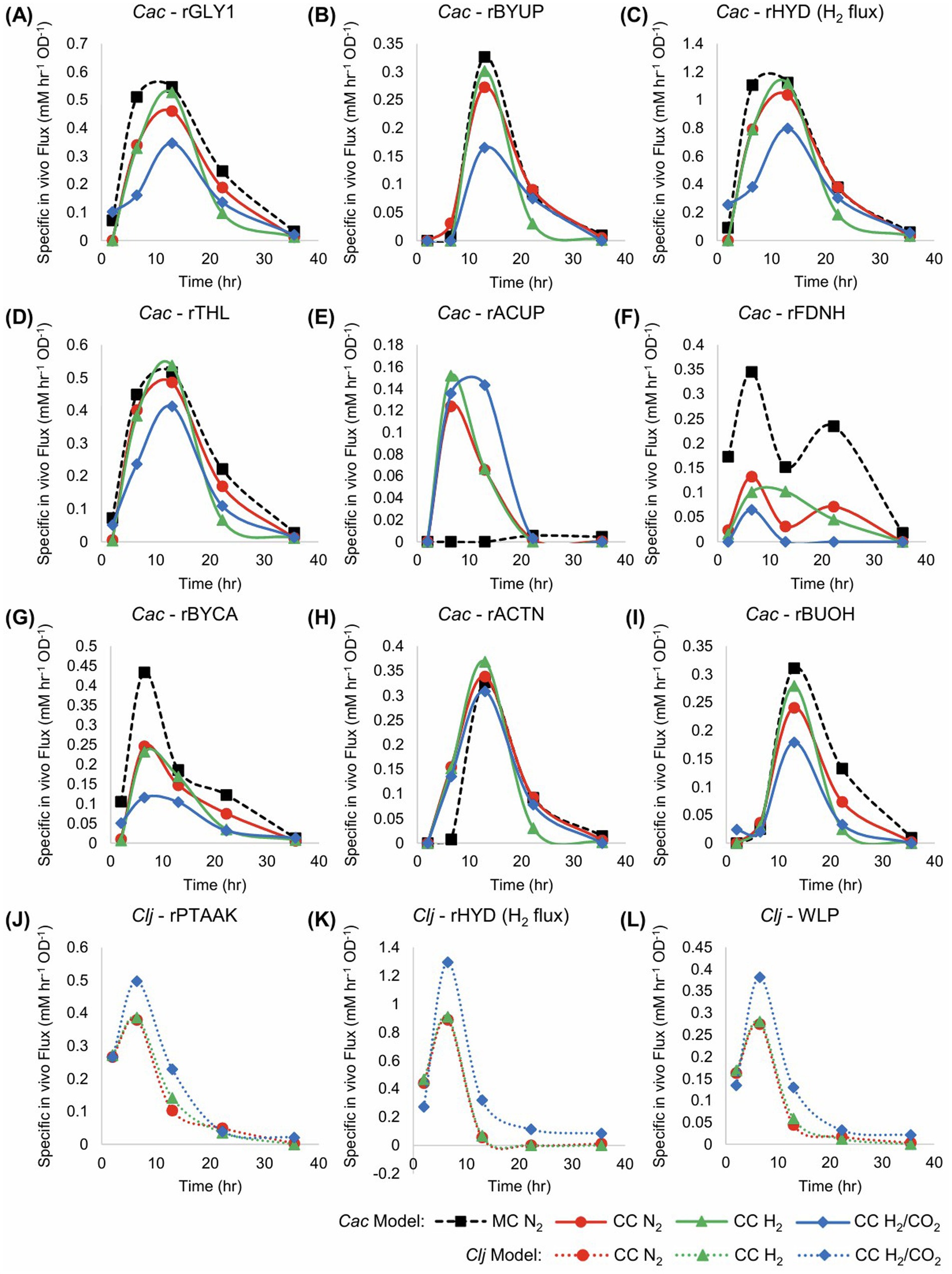 Figure 3. Fluxes of the monocultures (MC) and cocultures (CC) grown in pressurized serum bottles in units of mM/h/OD600, for the data of Figure 2. The flux maps are shown in Figure 1. Cac fluxes are depicted in panels (A–I), and Clj fluxes are depicted in panels (J–L) with dotted lines. The Cac monoculture with a nitrogen headspace is depicted with thick black dashed lines. The Cac monoculture has notably higher rGLY1, rBYUP, rHYD, rFDNH, rBYCA, and rBUOH fluxes. However, unlike the cocultures, it displays to no acetate uptake (E) (rACUP). Compared to the monoculture, in cocultures with the H2/CO2 atmosphere, Cac shows lower fluxes for rGLY1, rBYUP, rHYD, rTHL, rBYCA, and rBUOH, but higher fluxes for acetate uptake (rACUP). Clj clearly has higher fluxes with H2/CO2 atmosphere, suggesting the benefits of CO2 availability in the coculture setting. The pure N2 and pure H2 atmospheres performed similarly, suggesting that the use of CO2 generated by Cac did not require additional, exogenous H2 beyond the H2 produced by Cac.