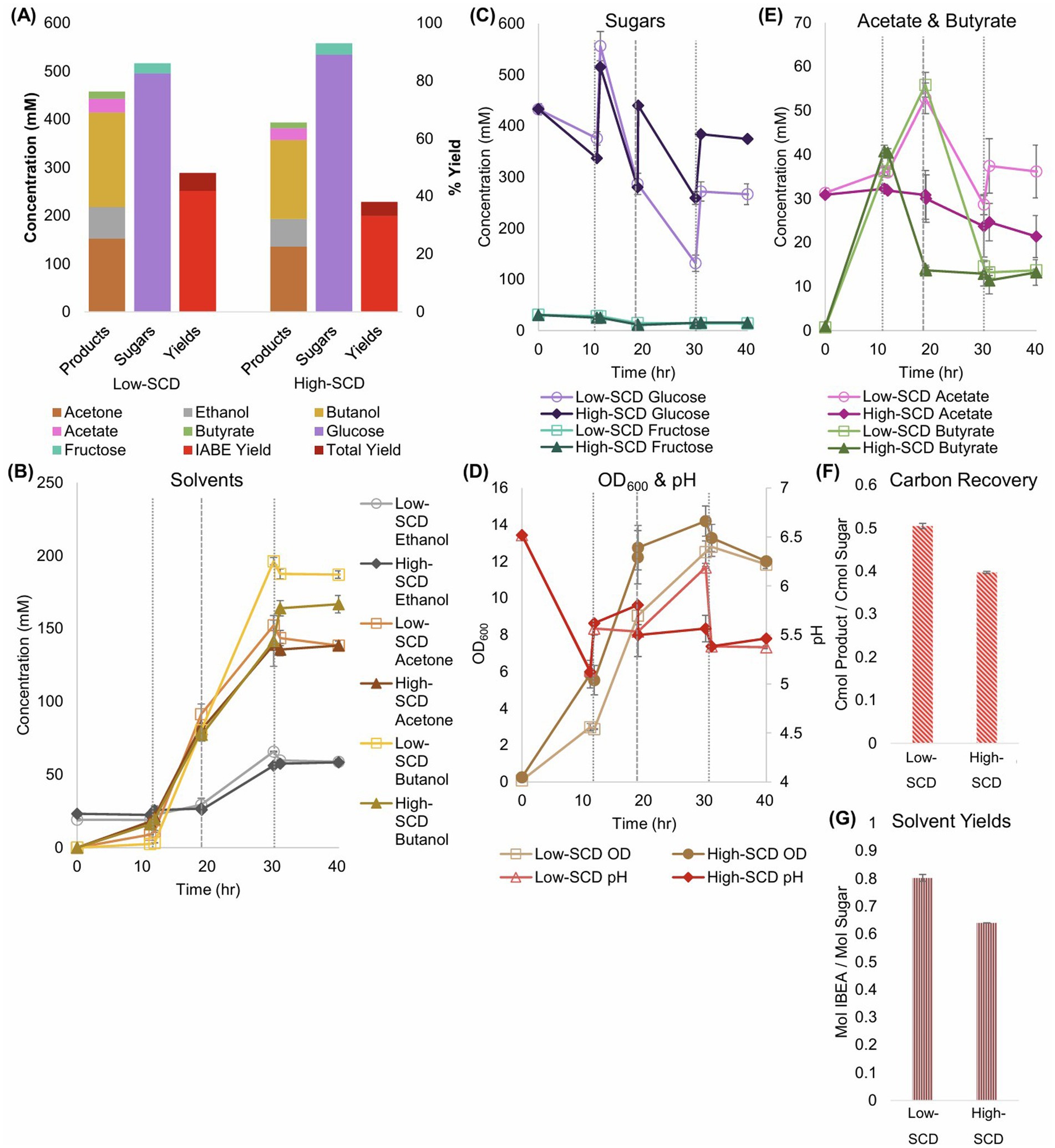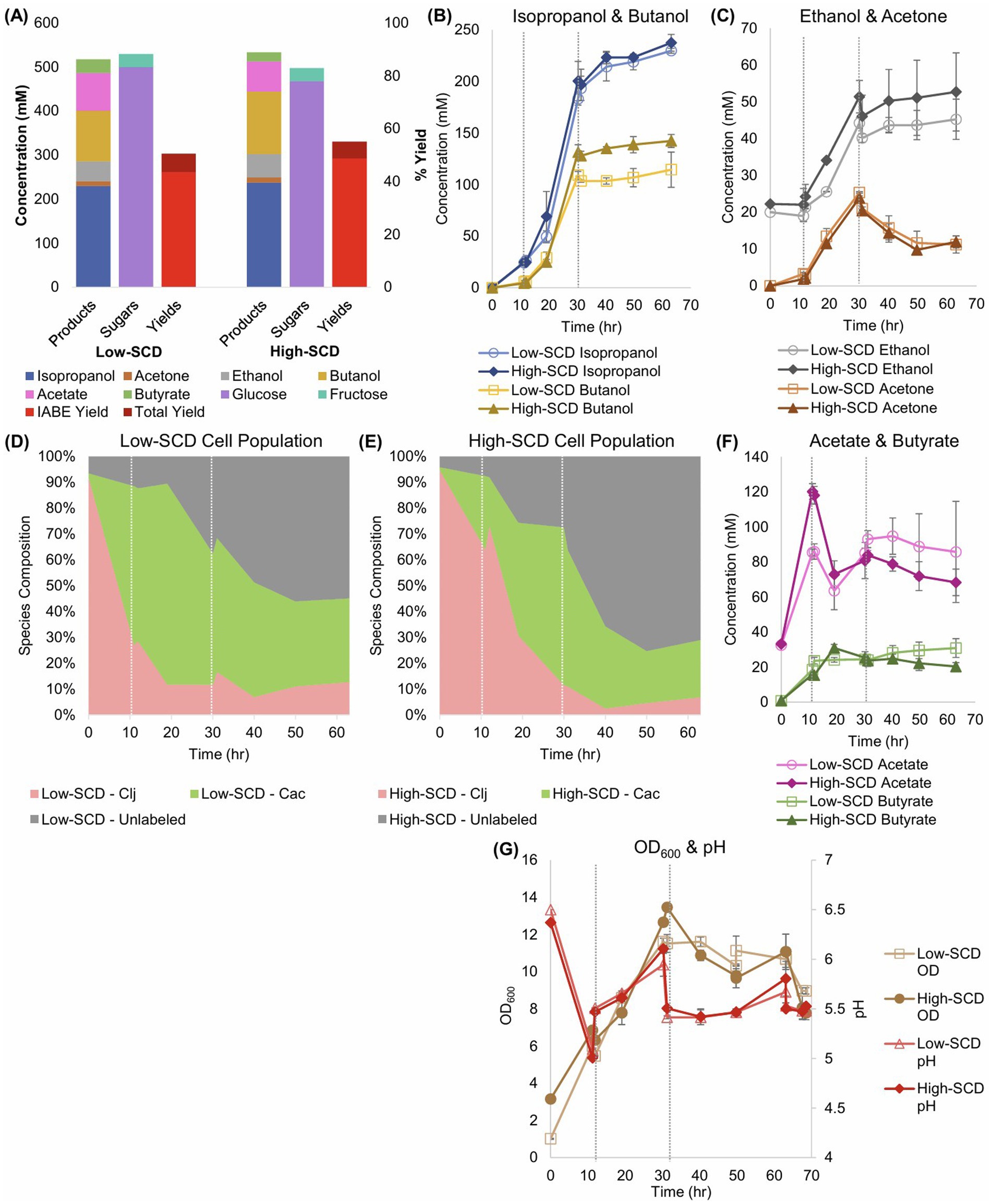 Figure 6. Sugar consumption, metabolite production and yields, and total biomass (OD600) of low- and high-SCD Cac and Clj cocultures. The vertical, short-dashed lines represent glucose additions to the bioreactors. (A) Summary of sugar consumption, metabolite concentrations and yields. IABE yield refers to only IPA, BuOH, EtOH, and acetone. The total yield also includes butyrate and acetate. (B) IPA and BuOH formation kinetics. (C) The EtOH and acetone formation kinetics. (D,E) Species composition over time, as determined by RNA-FISH labeling for (D) the low-SCD and (E) the high-SCD. (F) The acetate and butyrate concentration kinetics. Cac can produce and uptake both acetate and butyrate; acetate is the main product of Clj. (G) The OD600 (left y-axis) and pH (right y-axis) kinetic profiles.