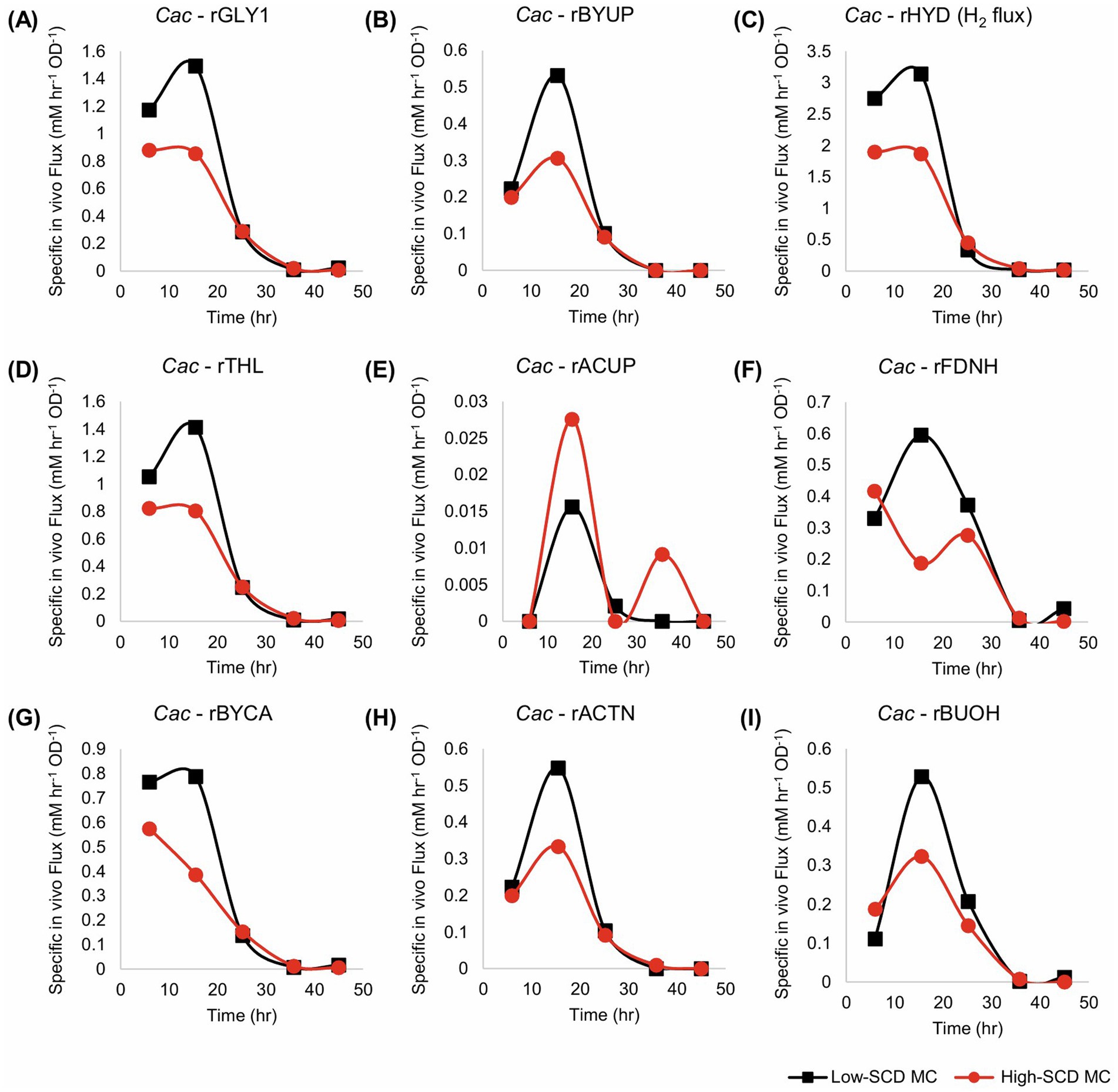 Figure 5. Metabolic fluxes (mM/h/OD600) of the monocultures corresponding to Figure 4. Cac fluxes are depicted with solid lines on panels (A–I). With the exception of rACUP, the cultures with a lower SCD displayed higher fluxes.