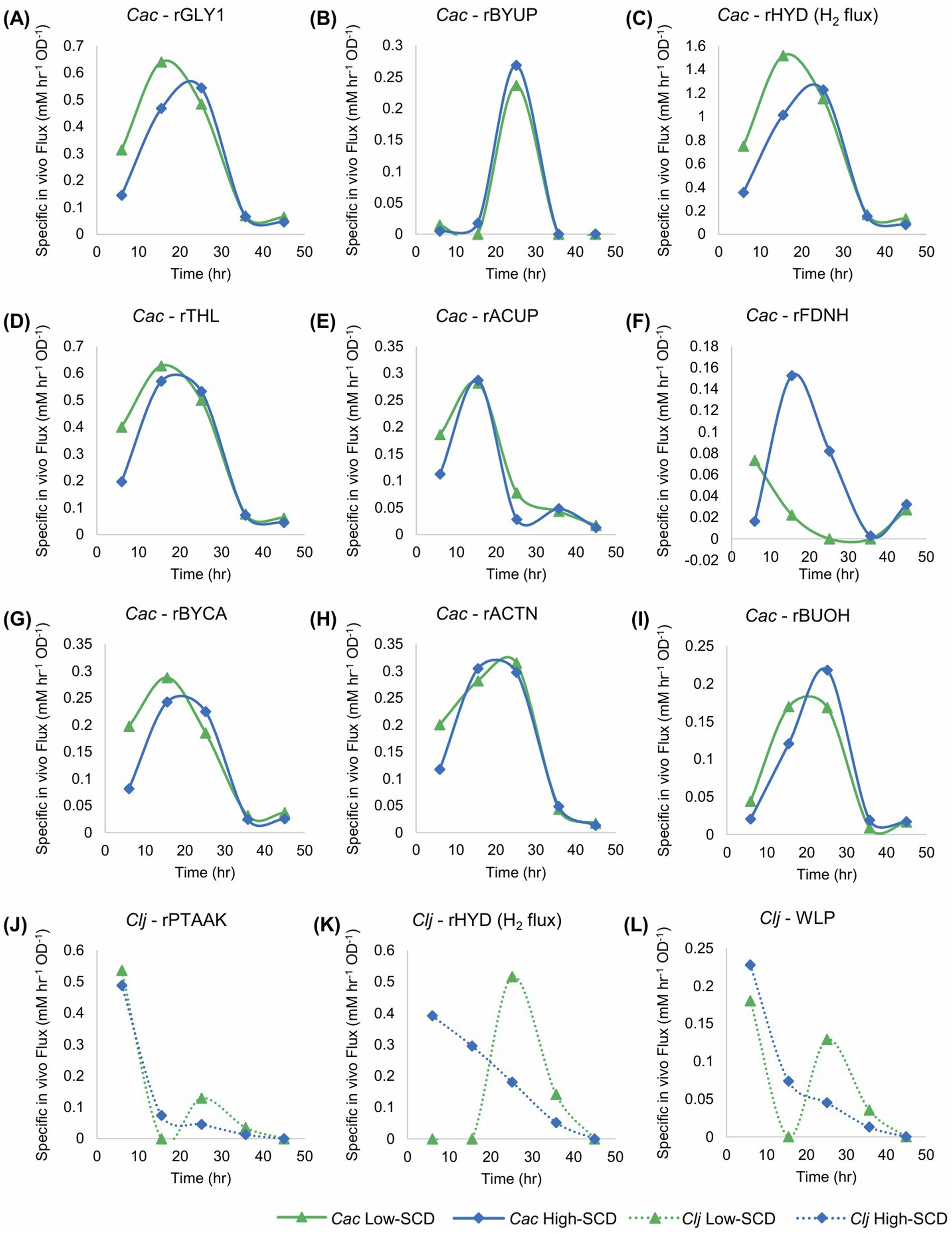 The differences between Clj activity in the high and low SCD conditions is stark. Hydrogen uptake (the rHYD flux) is very distinct, as it starts high and decreases monotonically in the high SCD condition, while remaining zero up to 15 h and then increasing dramatically to reach a peak around 25 h. This means that the high SCD cultures are electron-limited until the very end of the active cell growth period. In contrast, the high SCD cultures are electron-sufficient until about 15 h becoming electron limited after that until the end of the active cell growth. What is also interesting is the period between 10 and 30 h where, in Cac, rACTN was very high (Figure 7H), consequently forming more of CO2 and H2 (compared to alcohol production) for Clj, but only at low SCD Clj seems to strongly engage its WLP during this time period as demonstrated by an increasing H2 uptake rate (rHYD) reaching a peak around 30 h (Figure 7K).