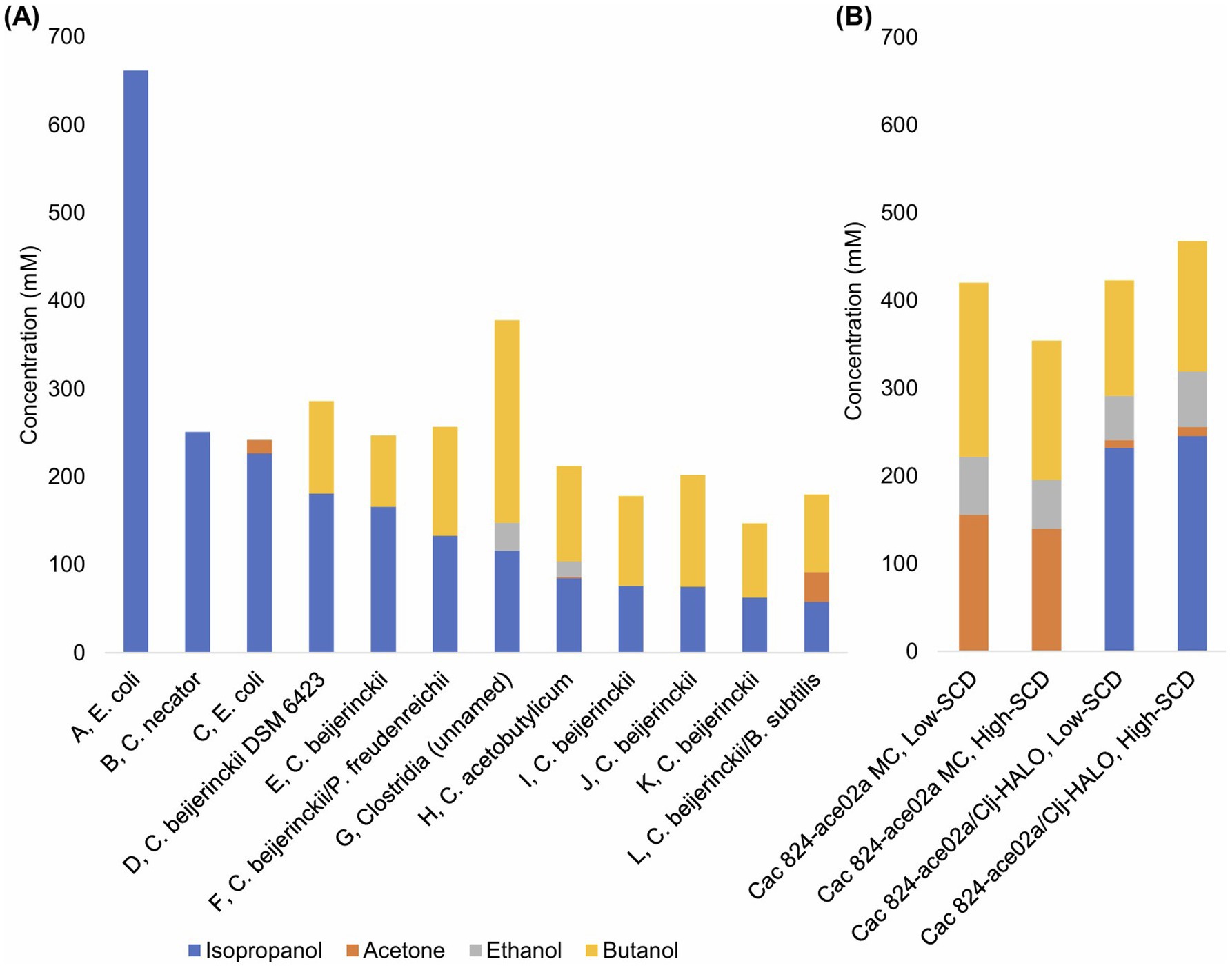 Figure 8. (A) Select metabolite concentrations in the literature for monoculture, coculture, and mixed culture productions of IABE. The letters A–K preceding the commas correspond to the row headings in Table 1. (B) Data from this study for low-SCD and high-SCD Cac 824-ace02a monocultures and Cac 824-ace02a/Clj-HALO cocultures. Note the higher total IABE titer and superior IPA:BuOH ratios.