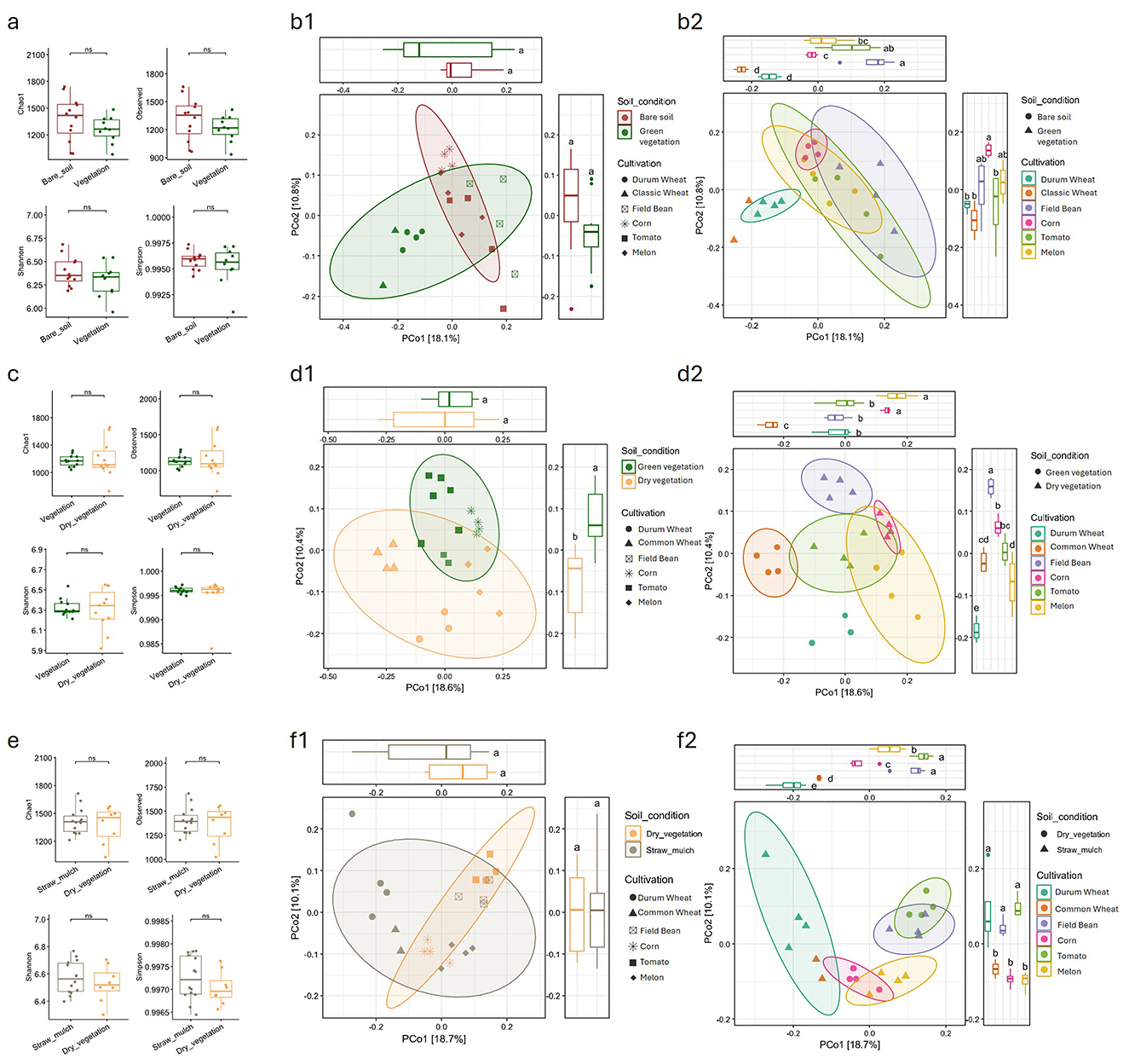 Figure 1. Alpha and beta diversity of soil microbial communities across different seasons (March, June, September) and crop cultivations. (a, c, e) Boxplots show alpha diversity indices, for each crop and season, grouped by cultivation stage (soil condition), with statistical comparisons between groups. (b1, d1, f1) Principal Coordinate Analysis (PCoA) plots based on Bray-Curtis dissimilarity illustrate beta diversity by soil condition for each sampling, with 95% confidence ellipses. (b2, d2, f2) PCoA plots further differentiate beta diversity by crop type within each season, with corresponding boxplots for PCoA axes. Distinct clustering patterns and diversity metrics highlight the influence of both seasonality and crop type on soil microbial community structure. Statistical significance is indicated where relevant.