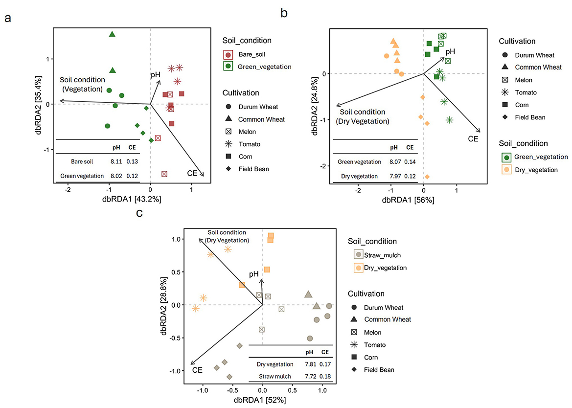 Figure 2. Distance-based redundancy analysis (dbrda) biplots illustrating the relationships between soil cover types and physicochemical properties (pH and electrical conductivity, CE) across different crop species, for each sampling time [March, panel (a); June, panel (b); September, panel (c)]. Different symbols represent crop types (e.g., Durum wheat, Common wheat, Muskmelon, Tomato, Corn, Field bean), and arrows indicate the direction and strength of soil variables' influence. Inserts show mean pH and CE values for each soil condition.