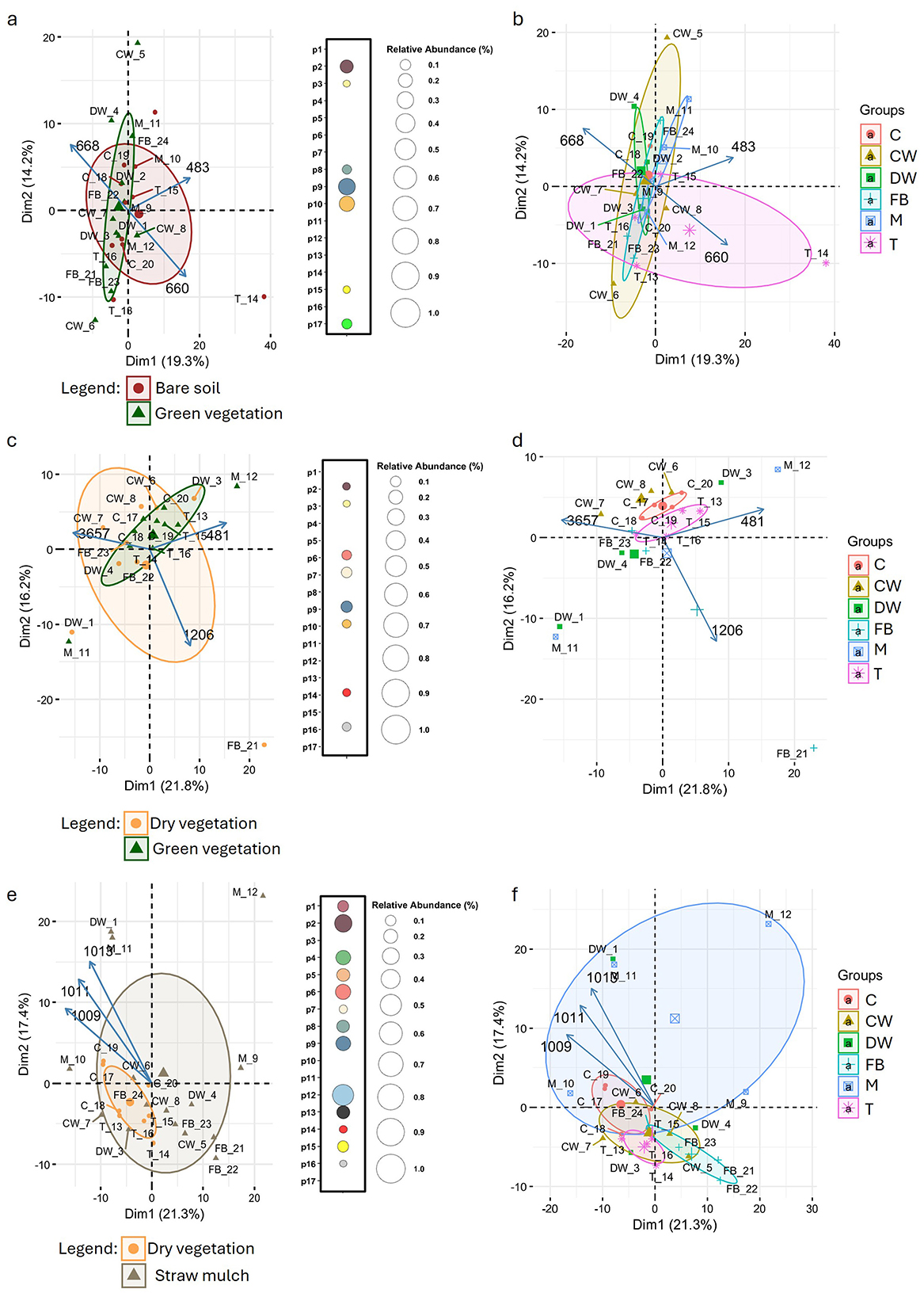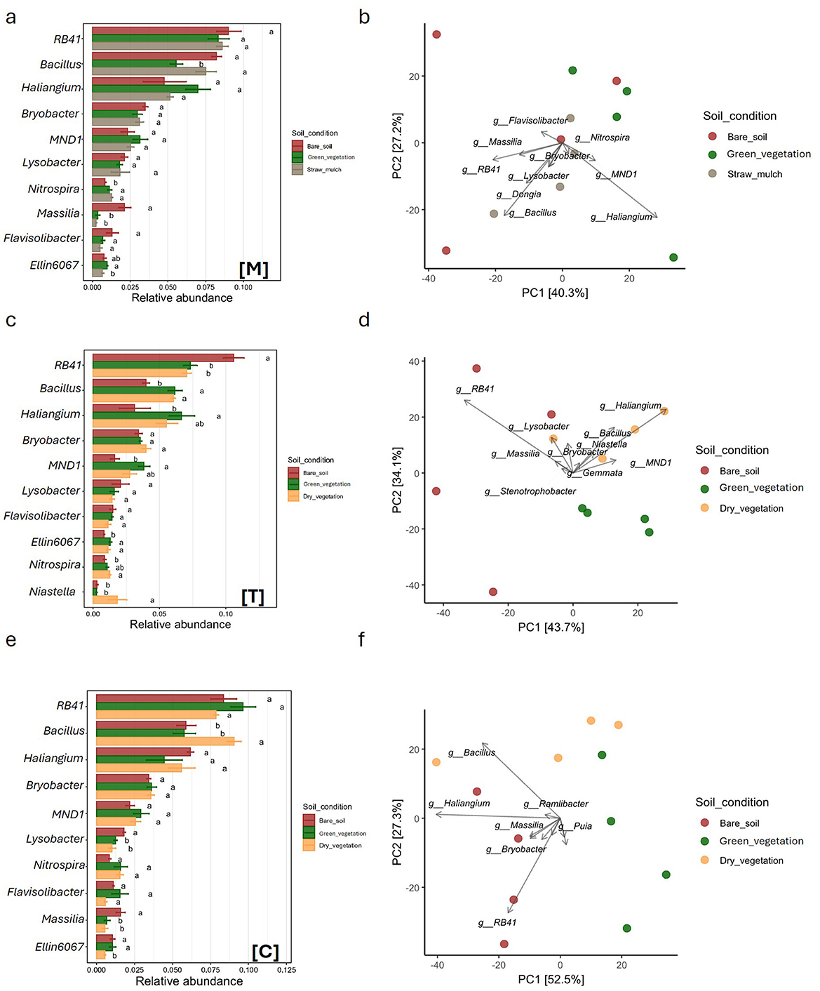 ![Grouped image presenting bar charts and PCA plots illustrating bacterial abundance across different soil conditions. Charts (a), (c), and (e) display relative abundance of bacterial genera under conditions labeled as Bare soil, Green vegetation, and Straw mulch or Dry vegetation. Corresponding PCA plots (b), (d), and (f) exhibit clustering based on soil conditions, highlighting dominant genera. Each section is labeled [M], [T], or [C] for identification. Colored dots in plots correlate with the legend for soil conditions.](https://www.frontiersin.org/files/Articles/1675394/fmicb-16-1675394-HTML/image_m/fmicb-16-1675394-g004.jpg)