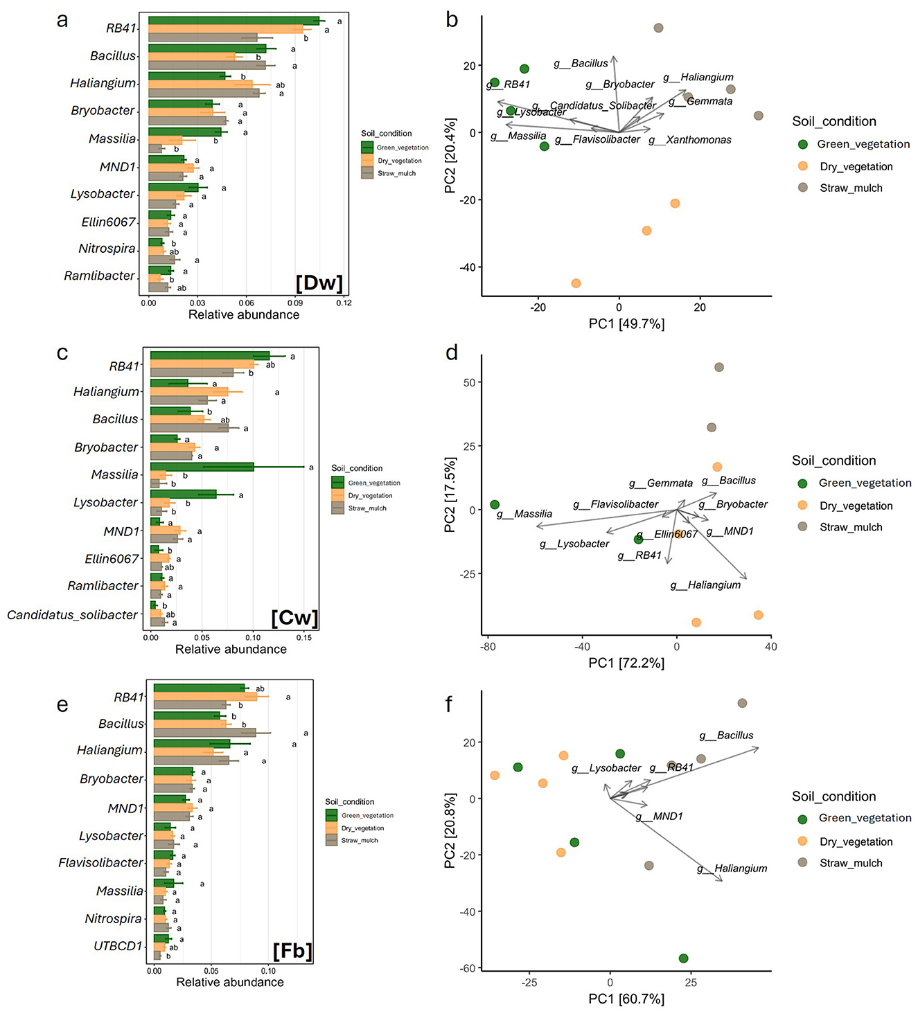 Figure 3. Comparison of soil bacterial community structure under three distinct soil condition, green vegetation (green), dry vegetation (yellow), and straw mulch (gray), across three crop types: Durum Wheat [Dw], Common Wheat [Cw], and Field Bean [Fb]. Panels (a, c, e) display bar plots of relative abundances for dominant bacterial genera, with statistical significance among treatments indicated by different letters above bars (a, b, ab). Panels (d, e, f) present PCA ordinations depicting the variation in bacterial community composition based on genus-level data, with samples color-coded by soil condition. Axes denote principal components PC1 and PC2, alongside the percentage of variance explained. Directional vectors highlight bacterial genera contributing to separation among treatments.