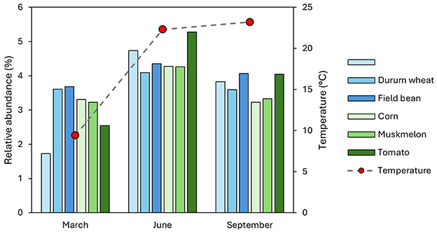 Being six distinct species, the rotation crops exhibited distinct growth stages at the three sampling times. In March, winter crops (field beans, soft wheat, and durum wheat) were green and actively growing, while summer crops (tomato, corn, and muskmelon) had not been established yet, thus the soil was bare. In June, winter crops had reached maturity and showed dry vegetation, while summer crops were in their full vegetative stage. Finally, in September, winter crops and muskmelon had been harvested, leaving the soil with just the straw mulch. Corn and tomato were in the maturation stage, with dry vegetation and some remaining fruit on tomato plants (Supplementary Figure 1).