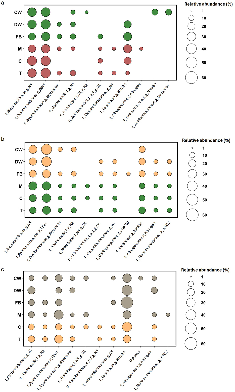 Figure 6. Core microbiota composition of the six crops, common wheat (CW), durum wheat (DW), field bean (FB), corn (C), tomato (T), and muskmelon (M), across the three seasonal sampling times: March (a), June (b), and September (c). Each panel displays bubble plots depicting the relative abundance of dominant bacterial taxa per crop, with bubble size reflecting proportional abundance. Crop stages are represented by color: brown = bare soil, yellow = dry vegetation, green = green vegetation, and gray = straw mulch.