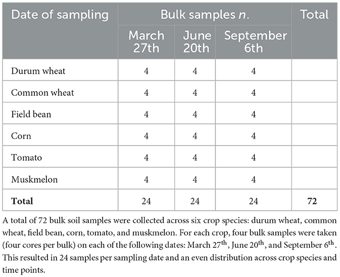 Starting from October 2001, a 6-year crop rotation had been implemented with a fixed sequence of crops: (1) corn (C), (2) processing tomato (T), (3) durum wheat (DW), (4) field bean (FB), (5) muskmelon (M), and (6) common wheat (CW). To accommodate all the six crops in each year, the field was divided into six sectors, and six different crop rotation arrangements (R1–R6) were used, each starting with a different crop. For example, in the 2018/2019 season, after three full rotation cycles (i.e., 18 years), the crops in each sector were as follows: durum wheat in R1, soft wheat in R2, muskmelon in R3, processing tomato in R4, corn in R5, and field bean in R6. Soil sampling was performed using a 4 cm diameter core drilling tool to collect soil from the top 0–20 cm layer. In each sector (R1–6, i.e. for each culture), four sampling points were selected in the core area (excluding border furrows and plot edges), each sampling represents the biological replicates. At each sampling point, four cores were taken randomly, when the crop was not present, or in between two contiguous crop furrows, when crop furrows were visible. The four cores from each sampling point were mixed in a sterile plastic bag and stored at −80 °C for further analysis, improving sample homogeneity and minimizing spatial micro-variability. These pooled samples were not considered independent pseudo replicates but rather a single biological replicate. Each sector was treated independently, with no overlap in sampling points between sectors, ensuring statistical independence among replicates for a given crop. Sampling took place on three dates: March 27th, June 20th and September 6th, 2019. A schematic description of the experiment in the year 2018/2019, including crop growth stages, are reported in Supplementary Figure 1 and Table 1. A detailed description of the field management and condition at the time of sampling has been already described (Pierantoni et al., 2024).