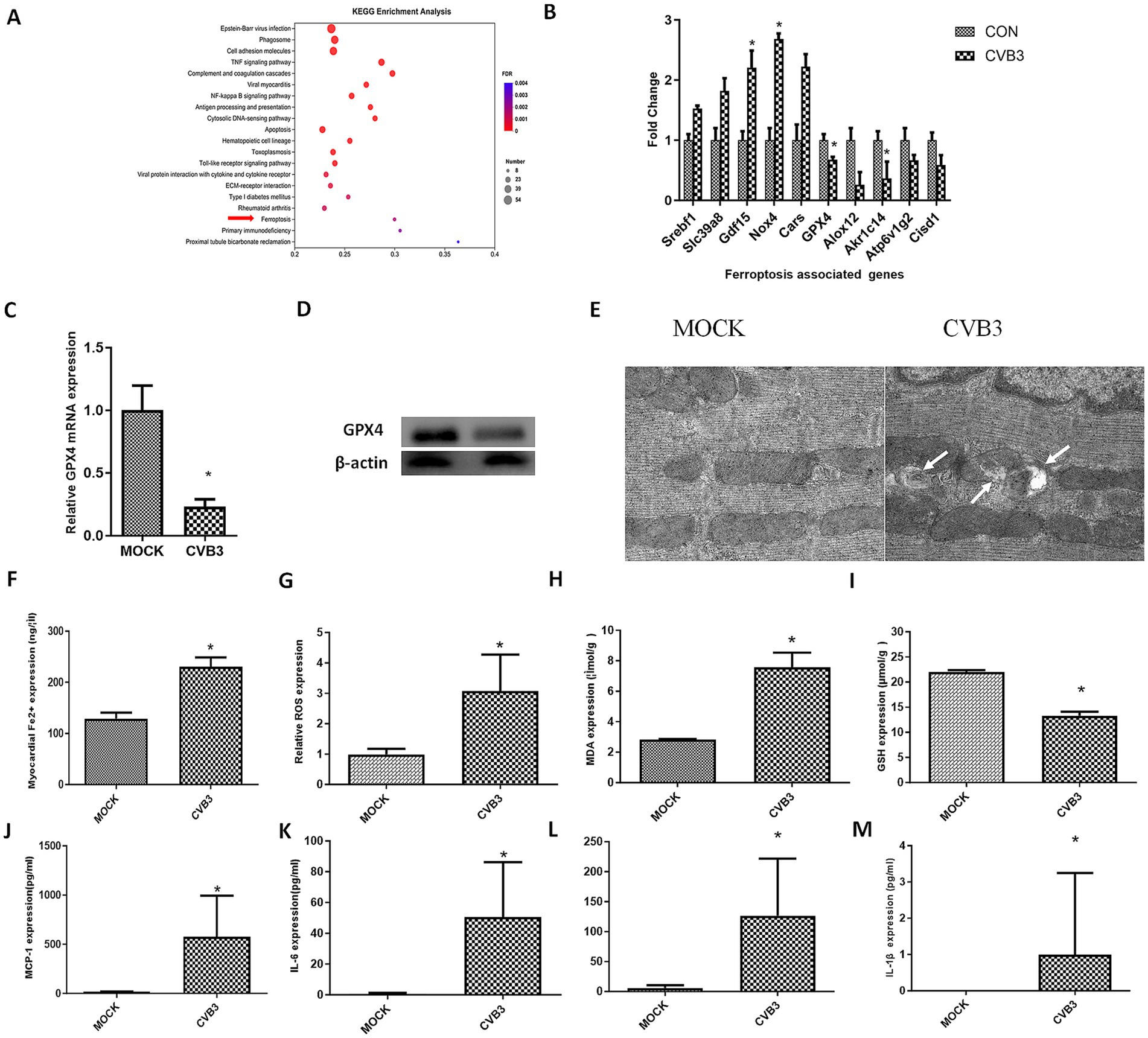 Figure 1. CVB3 infection induces ferroptosis in a virus-induced myocarditis mouse model. BALB/c mice were infected intraperitoneally with 1.0*105 plaque-forming units of CVB3, corresponding to the LD50 for mice. MOCK-infected mice received intraperitoneal injections of DMEM and were included as the MOCK group. (A) The top 20 KEGG-enriched pathways, including the ferroptosis signaling pathway. (B) Differently expressed genes associated with ferroptosis are shown. The data used for (A,B) were obtained from our previous study (Zhang et al., 2013). (C) The mice were anesthetized and sacrificed for heart collection. The tissues were then homogenized for RNA extraction, and real-time quantitative PCR detection of GPX4 was conducted. (D) GPX4 expression was detected in the hearts of the CVB3-infected mice. (E) The mice were anesthetized and sacrificed for heart collection. Morphology of mitochondria in myocardial tissue was observed. Representative electron microscopy images indicating mitochondrial membrane ruptures (white arrows), reduced volume, and decreased cristae. (F) Contents of ferrous ions in myocardial homogenate tissue. Reactive oxygen species (ROS) (G), malondialdehyde (MDA) (H), and glutathione (GSH) (I) in the myocardial homogenate tissue are shown. Inflammatory cytokines in the serum of the infected mice were also detected: MCP-1 (J), IL-6 (K), IFN-β (L), and IL-1β (M). * indicates p < 0.05. A total of six mice were used in the experiment.