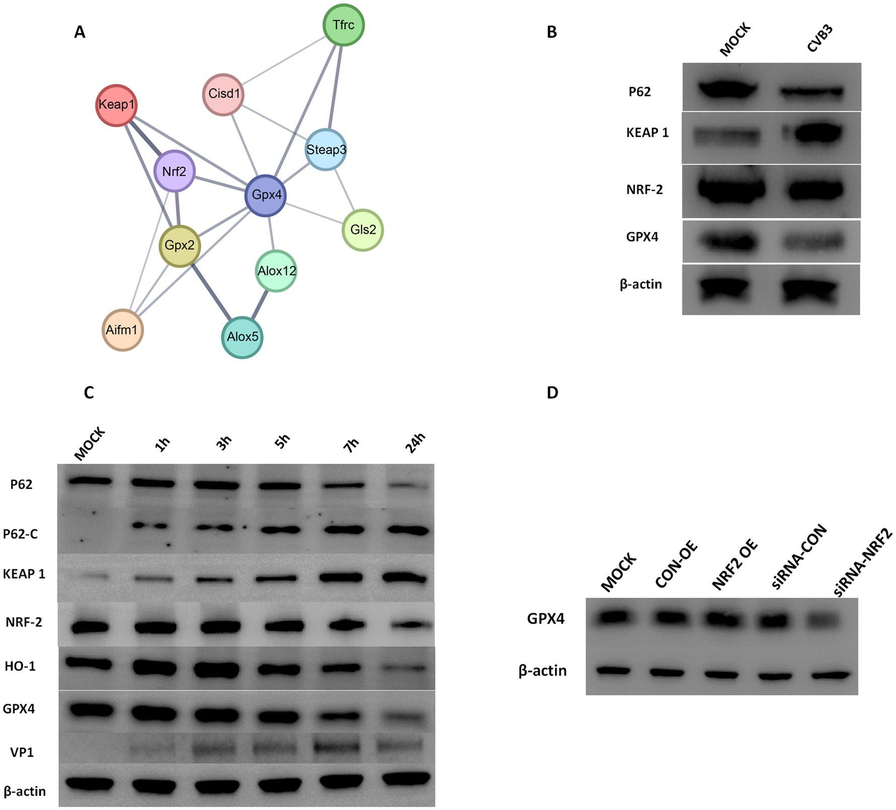 Figure 2. (A) Protein–protein interaction networks of downregulated and differentially expressed genes directly or indirectly related to GPX4. The thickness of the lines represents the credibility of the interaction between proteins (comprehensive score value). (B) CVB3 infection altered the expression of KEAP1, NRF2, and GPX4. AC-16 cells were infected with CVB3 at an MOI of 5, and profiling of total P62, KEAP1, NRF2, and GPX4 proteins was detected. β-actin is shown as a loading control. The results represent three independent tests. (C) CVB3 infection cleaved the P62 protein and altered the expression of KEAP1, NRF2, and GPX4. HeLa cells were infected with CVB3 at an MOI of 10, and the time course of profiling of total P62, cleaved P62, and the expression of KEAP1, NRF2, and GPX4 proteins was detected. β-actin is shown as a loading control. The results represent three independent tests. (D) Detection of GPX4 expression following NRF2 alteration during the CVB3 infection process. NRF2 was exogenously expressed or inhibited, followed by CVB3 infection at an MOI of 10. The expression of GPX4 was detected using western blotting 24 h post-CVB3 infection. OE indicating overexpression, * indicates p < 0.05. A representative result from three independent experiments is shown.
