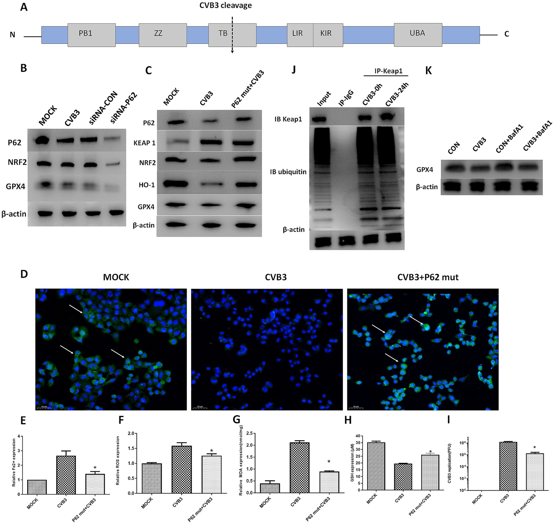 Figure 3. P62 participates in the KEAP1/NRF2/GPX4 axis and modulates ferroptosis in the CVB3 infection process. The P62 mutant was exogenously expressed, followed by CVB3 infection at an MOI of 10. (A) Schematic illustration of the P62 polyprotein. The arrow depicts the cleavage site of virus-encoded proteinases. (B) Detection of NRF2 and GPX4 in the CVB3-infected mice with silenced P62 at an MOI of 10 using western blotting 24 h after viral infection. (C) Detection of the KEAP-1/NRF2/GPX4 axis after P62 mutant overexpression in the CVB3 infection process using western blotting 24 h after infection. (D) Detection of NRF2 expression in the cell nucleus after P62 inhibition during the CVB3 infection process using immunofluorescence. Detection of ferroptosis-associated makers, including Fe2+ (E), ROS (F), MDA (G), and GSH (H), in HeLa cells after exogenous P62 expression during the CVB3 infection process. (I) Detection of CVB3 replication post-P62 overexpression 24 h after viral infection. (J) Cells were lysed 24 h post-CVB3 infection. Total KEAP1 protein and its interacting proteins were pulled down using an antibody against KEAP1, followed by immunoblotting (IB) with antibodies against KEAP1 and ubiquitin. HeLa cells without infection were used as the MOCK control. (K) HeLa cells were treated with 20 nM of BafA1 before CVB3 infection, and GPX4 expression was then detected. * Indicates p < 0.05, and a representative result from three independent experiments is shown.
