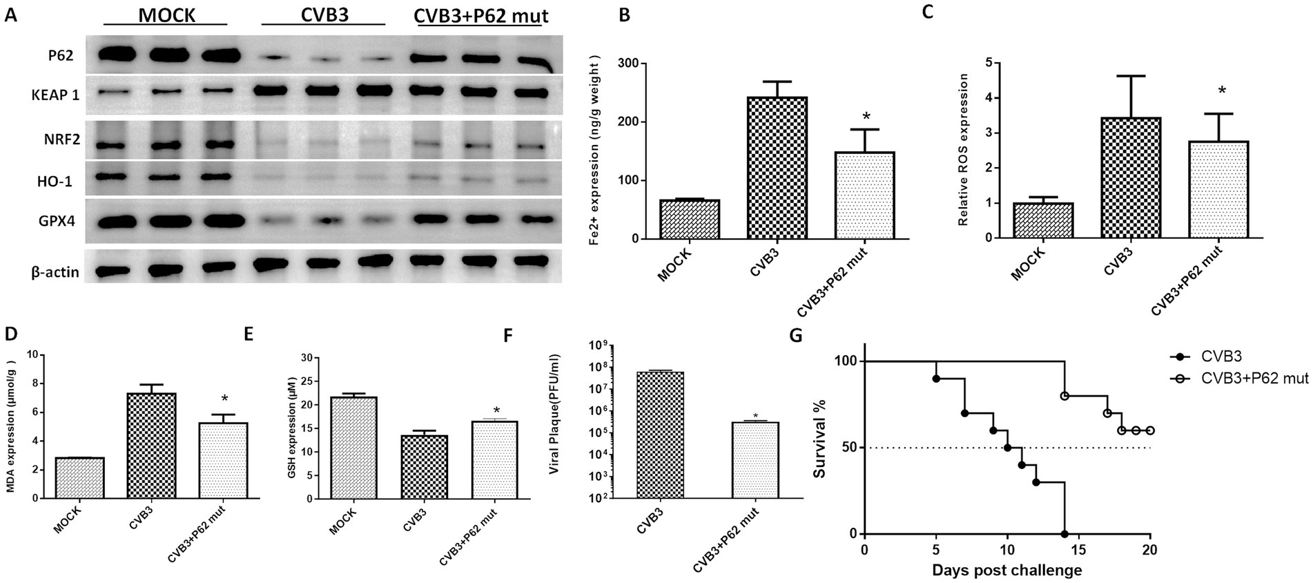 Figure 4. P62 protein supplementation inhibits ferroptosis and viral replication in vivo. (A) Detection of proteins in the KEAP-1/NRF2/GPX4 axis after the overexpression of P62 in the CVB3-infected mice using western blotting 5 days post-infection. P62 was overexpressed in the mice using an AAV containing the P62 gene, followed by CVB3 infection at a PFU of 105, which corresponds to the LD50 for mice. Detection of ferroptosis-associated makers after P62 overexpression and supplementation, including the contents of Fe2+ (B), ROS (C), MDA (D), and GSH (E) in the heart tissue 5 days post-CVB3 infection. (F) Titers of CVB3 in the heart tissue 5 days post-viral infection in the mice with overexpressed P62. (G) Survival of BALB/c mice post-CVB3 infection in the P62 overexpression group. * Indicates p < 0.05. A total of 10 mice were used in this experiment, and representative results of protein expression from three independent experiments are shown in (A).