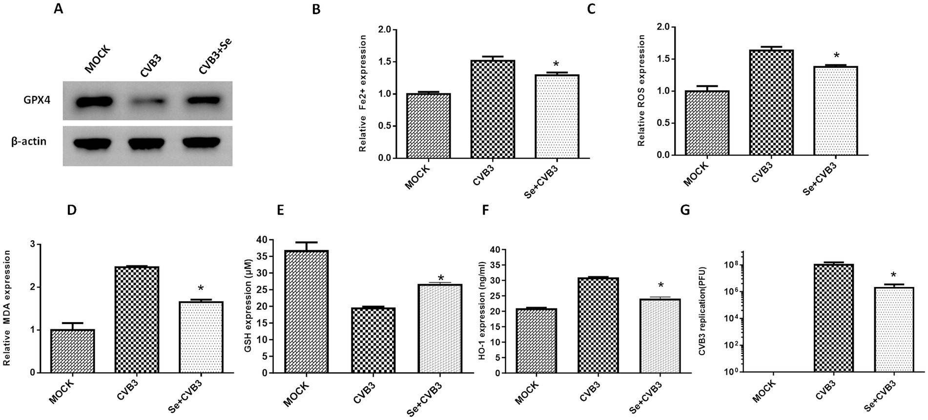 Figure 5. Selenium (Se) supplementation could alleviate ferroptosis in vitro. (A) Detection of GPX4 expression in HeLa cells supplemented with Se, followed by CVB3 infection, 24 h post-infection. The contents of ferroptosis-associated makers in HeLa cells, including Fe2+ (B), ROS (C), MDA (D), GSH (E), and HO-1 (F), as well as CVB3 replication, were also detected post-Se supplementation 24 h after viral infection (G). * Indicates p < 0.05. A total of three independent experiments were conducted, and a representative result of protein expression is shown in (A).