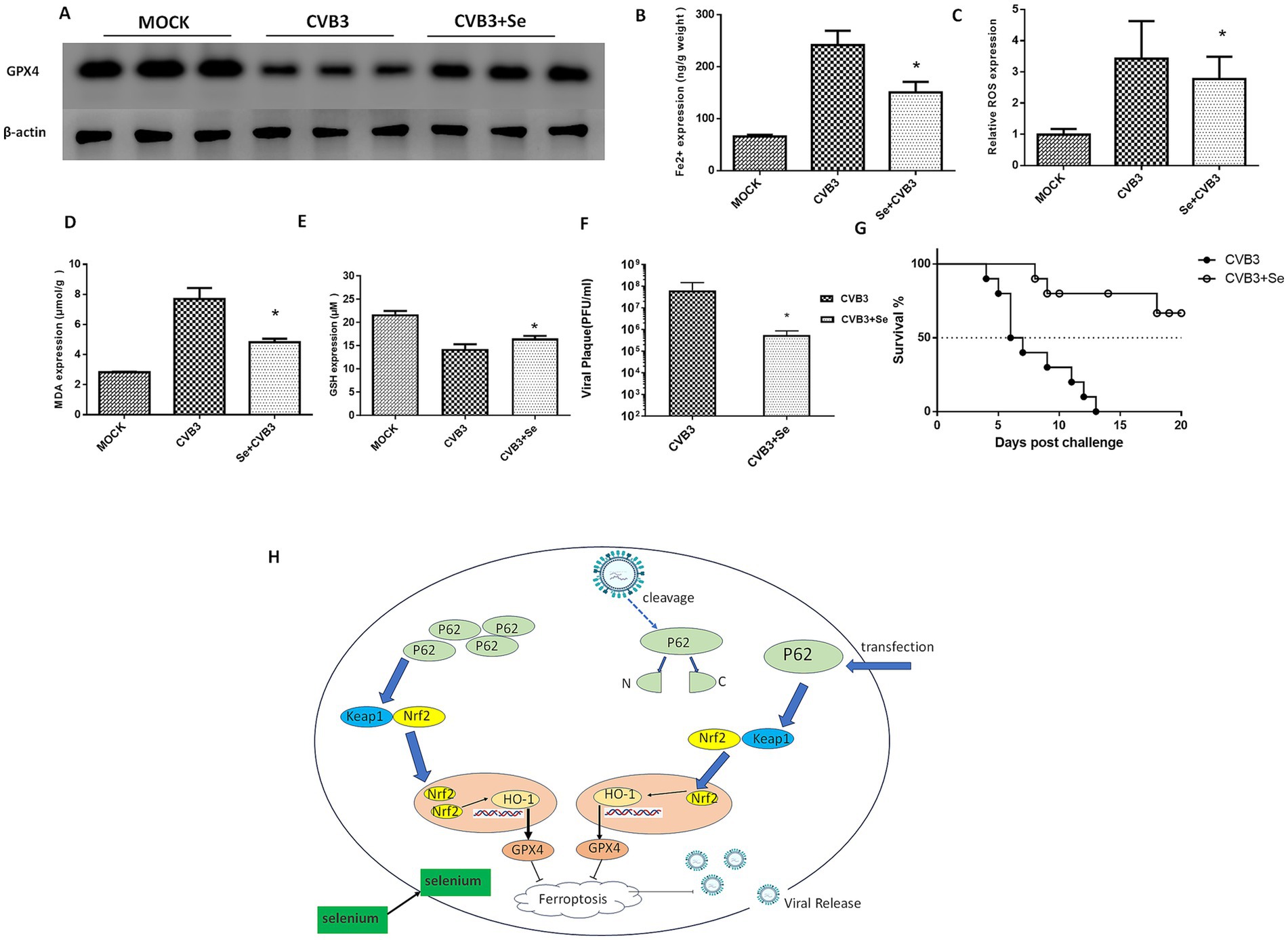 Figure 6. Selenium (Se) supplementation could inhibit ferroptosis and viral replication in vivo. (A) Detection of the GPX4 protein in the Se-supplemented and CVB3-infected mice 5 days post-infection. A selenium-enriched diet was provided to the mice for 7 days, after which they were infected with 105 PFU of CVB3 at LD50. Contents of ferroptosis-associated makers in the heart tissues, including Fe2+ (B), ROS (C), MDA (D), and GSH (E), were detected post-Se and P62 supplementation 5 days after CVB3 infection. (F) CVB3 titers in the heart tissue 5 days post-viral infection in the mice that were fed a Se-supplemented diet. Virus titers (PFU/g) were normalized to the tissue mass. The virus titers represent the means ± SD of three independent experiments (n = 5 mice/group). (G) Survival of the BALB/c mice after CVB3 infection in the Se-supplemented diet. (H) Schematic illustration of this study. * indicates p < 0.05. A total of 10 mice were used in this experiment. Representative results of protein expression from three experiments are shown in (A).