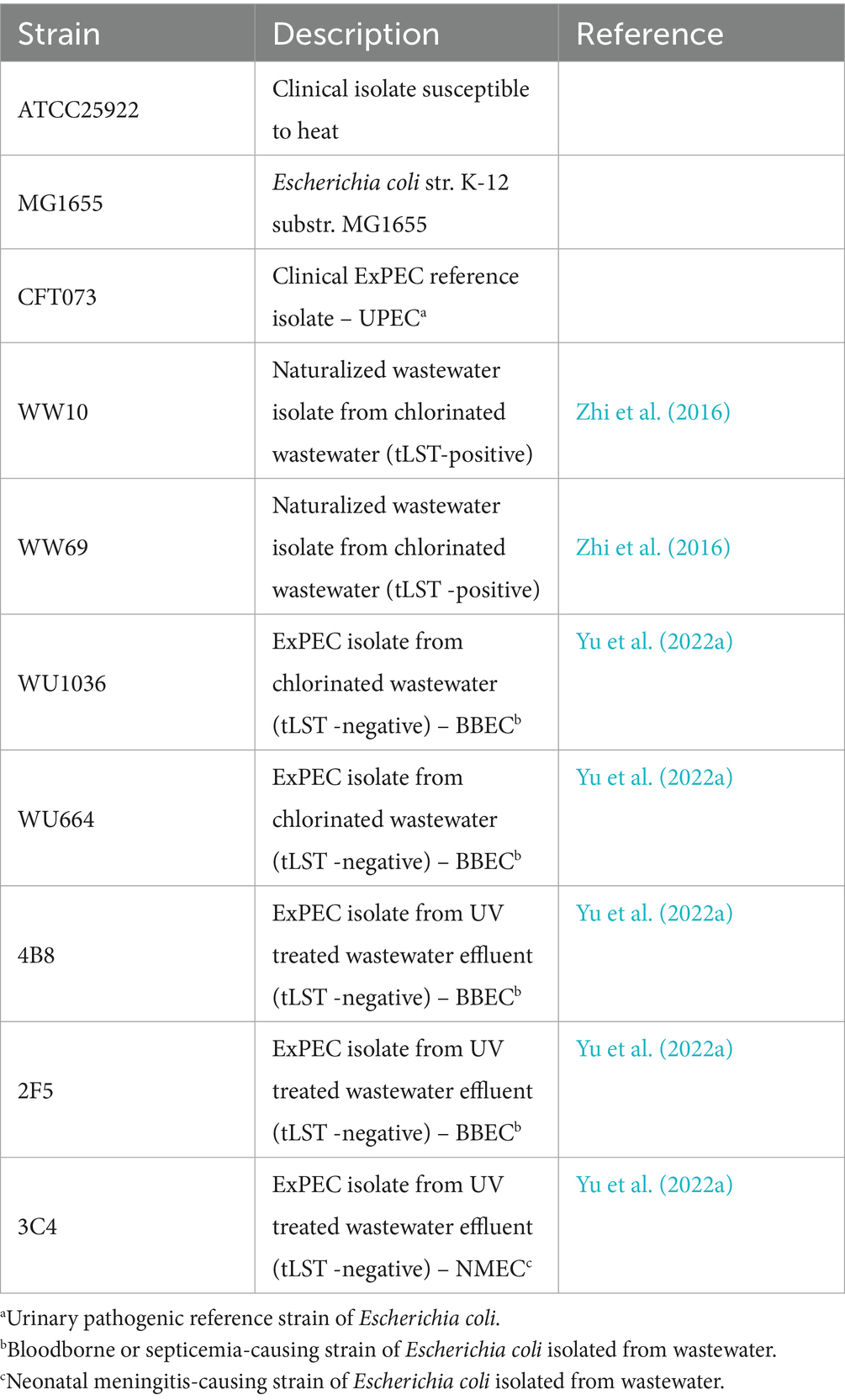All E. coli strains used in this study are listed in Table 1. The five W-ExPEC strains, WU1036 (BBEC), WU664 (BBEC), 4B8 (BBEC), 2F5 (BBEC), and 3C4 (NMEC), were isolated from chlorine-treated sewage or from treated wastewater effluents as previously described by Zhi et al. (2020), and the strains were genomically characterized by Zhi et al. (2020) and Yu et al. (2022b). E. coli ATCC 25922 and MG1655 were used as a heat-susceptible and -intermediate strains, respectively. CFT073 was purchased from the American Type Culture Collection and used as a reference clinical ExPEC strain with low heat resistance. Naturalized wastewater E. coli strains WW10 and WW69, originally isolated by Zhi et al. (2016), were previously identified as tLST-positive by Wang et al. (2020) and were used as extreme heat-resistant reference strains. All E. coli isolates were stored at -80 °C prior to use in assays described below.