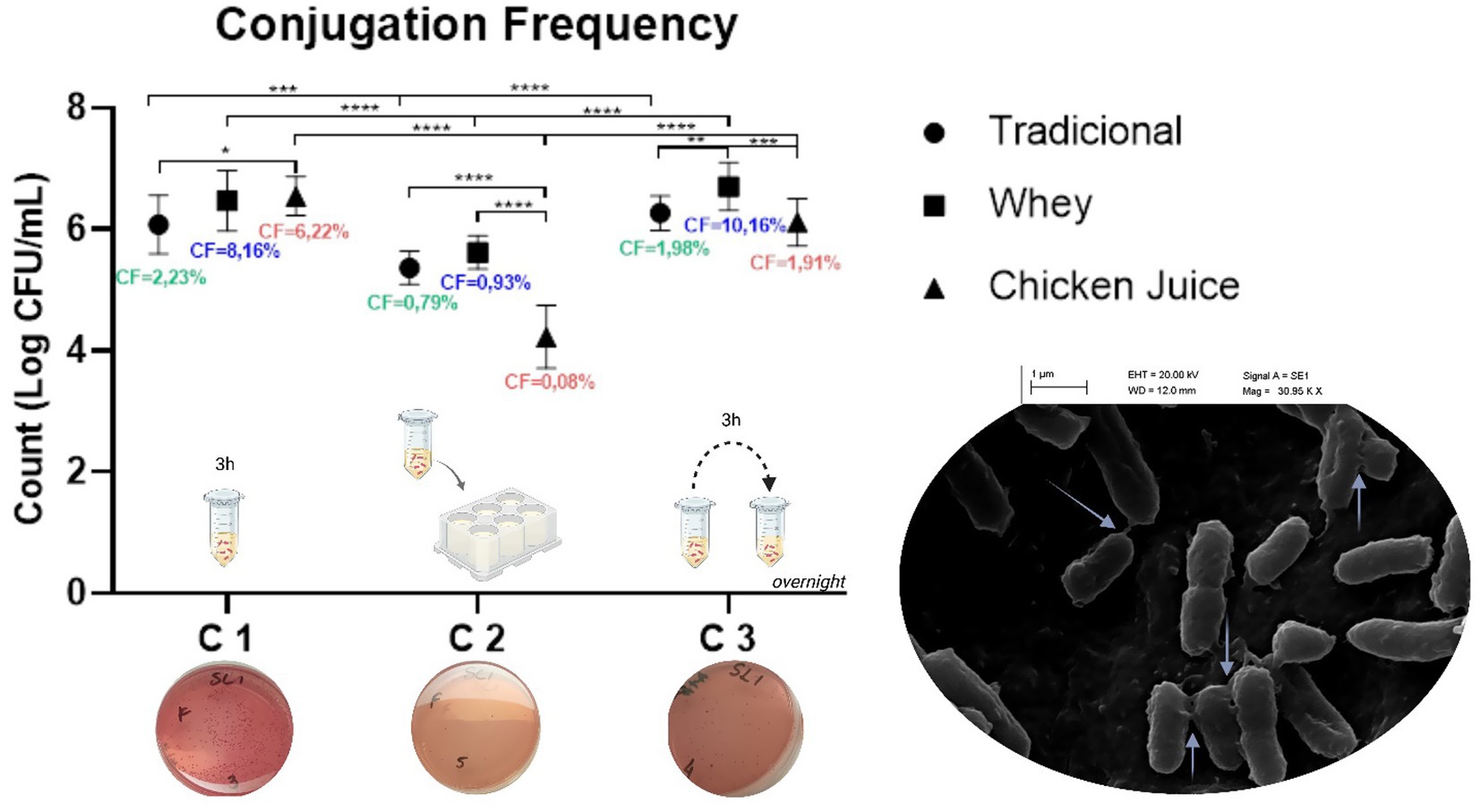 GRAPH 1. Conjugation frequencies in the different methodologies. C1: Conjugation 1, C2: Conjugation 2 and C3: Conjugation 3. *p < 0.05, **p < 0.01, ***p < 0.001, ****p < 0.0001 (one way ANOVA). The graph mentions the methodology used in each type of conjugation, as well as the phenotypic demonstration of the presence of E. coli transconjugants on MacConckey plates. The scanning electron microscopy (SEM) image of bacterial conjugation between Salmonella Heidelberg and Escherichia coli (on the right) demonstrates multiple pili (arrows) for horizontal gene transfer (image obtained at 30,000 × and 40,000 × magnifications).