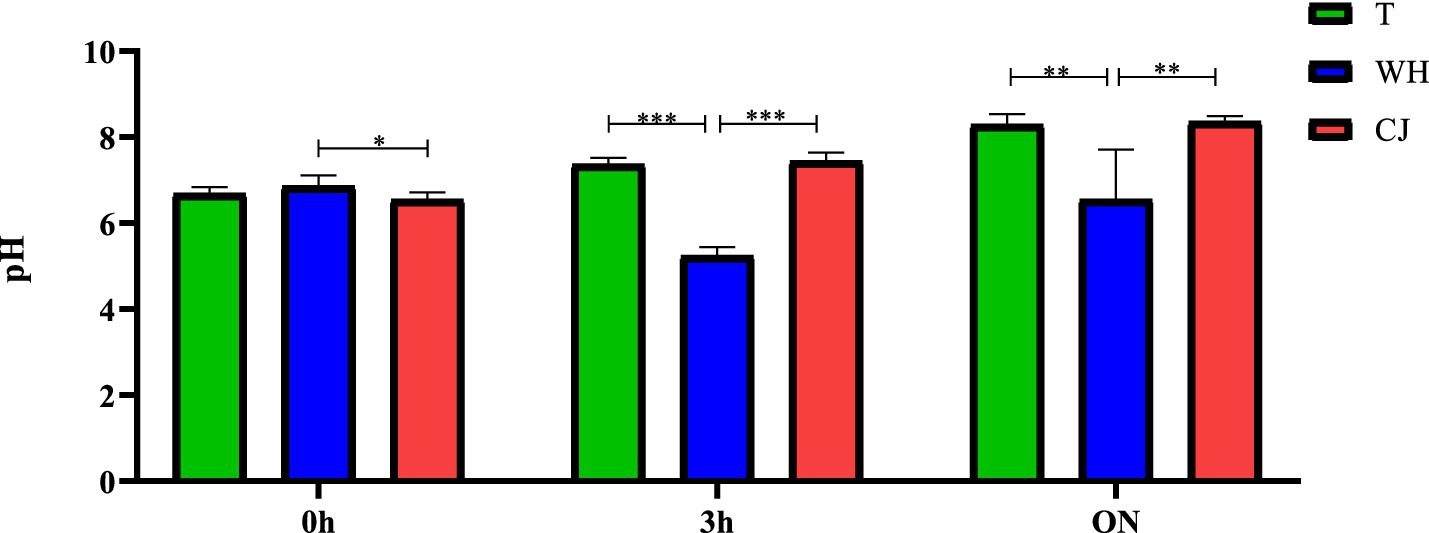 GRAPH 2. pH variation of the conjugation media in liquid at the different incubation times. T = traditional, with Luria Bertani (LB). WH = LB + 5% whey. CJ = LB + 5% chicken juice. 0 h: Immediately after donor and recipient were joined (start of conjugation). 3 h: End of conjugation 1. ON = overnight (End of conjugation 3). *p < 0.05, **p < 0.01, ***p < 0.001 (one way ANOVA). Different uppercase letters in the same row indicate statistical difference by ANOVA test (p < 0.05); different lowercase letters in the same column indicate statistical difference by ANOVA test (p < 0.05); T, Traditional/No supplement; WH, Whey; CJ, chicken juice. Conjugation 1: Liquid medium, incubated at 37 °C, for 3 h, 20 rpm; Conjugation 2: Solid medium, incubated at 37 °C, overnight, without stirring; Conjugation 3: Liquid medium, incubated at 37 °C, overnight, without stirring.
