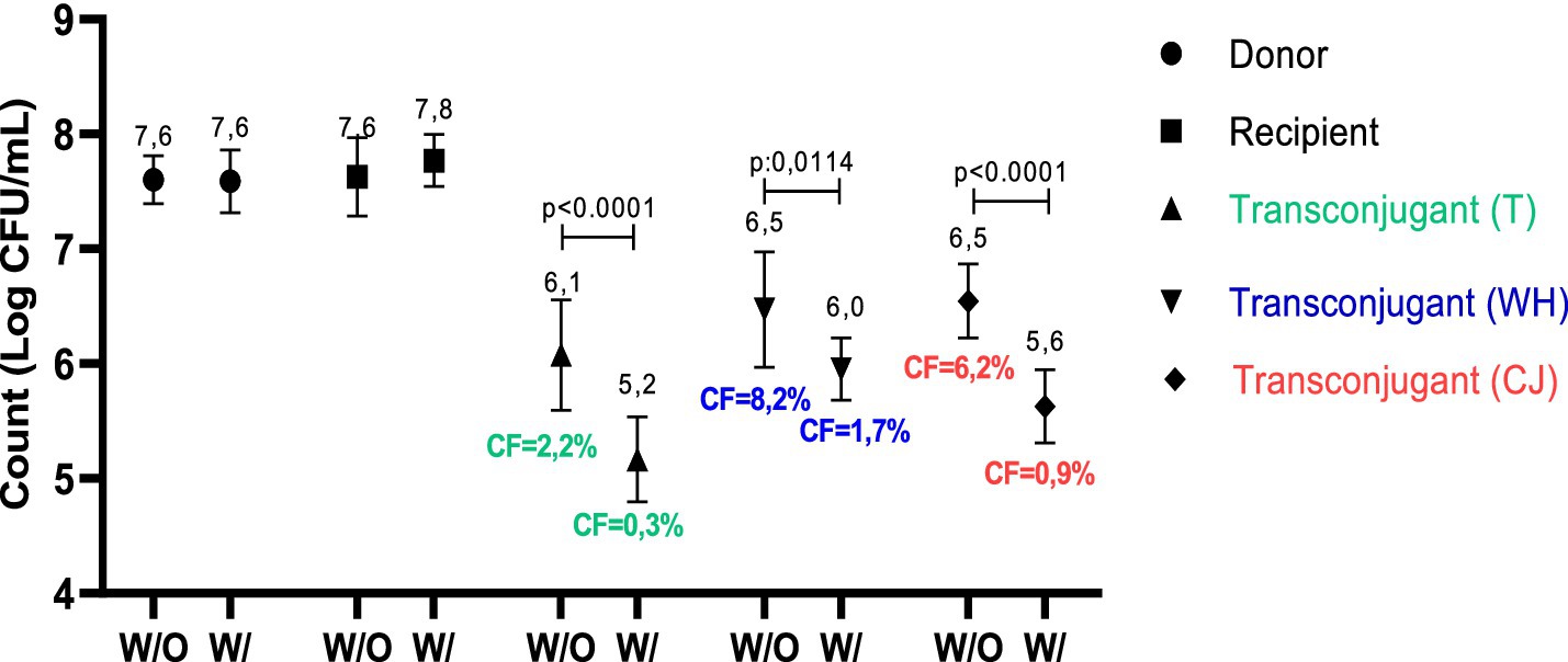 For conjugation protocol 1, SH and J53 were mixed (1:4 ratio) in a final volume of 1 mL. In parallel, the same process was carried out, but adding 5% of the WH or CJ (50 μL) to 190 μL of the donor strain and 760 μL of the recipient strain previously grown in LB. Finally, the tubes containing the cocultures, with and without the addition of WH and CJ, were incubated at 37 °C with slow agitation (20 rpm) for 3 h.