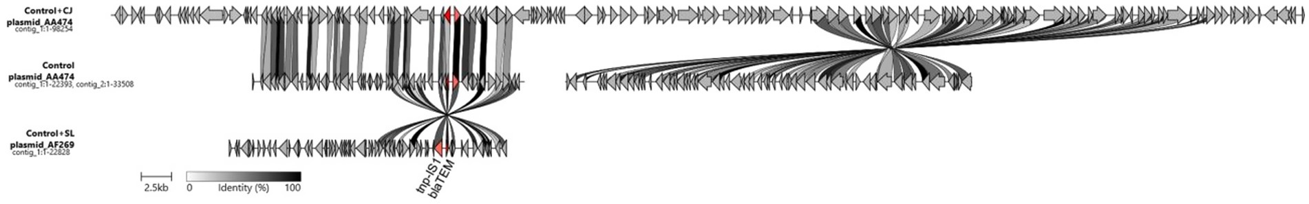 Fourteen plasmids were identified in the sequenced genomes, with each genome having between one and three plasmids (Supplementary Table 3). The blaTEM gene was identified in three plasmids, which were in the genomes of control E. coli (without CJ, WH and Lu54), control + CJ and control + WH. These plasmids were annotated with Bakta (Schwengers et al., 2021), and compared using clinker (Gilchrist and Chooi, 2021), to visualize blaTEM (Figure 1).