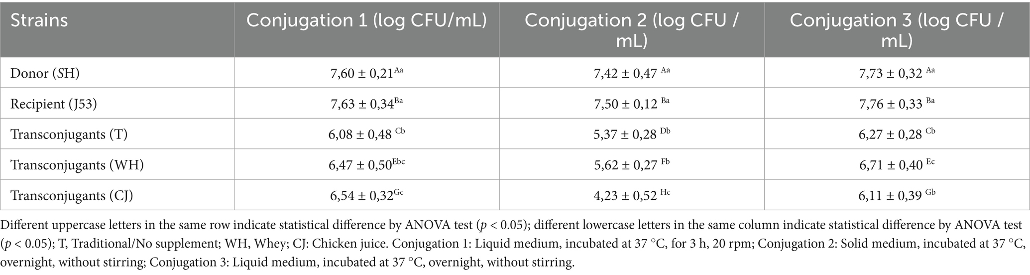 Table 1. Mean count (Log CFU/mL) of donor, recipient, and transconjugant bacteria and conjugation frequency obtained in the three conjugation protocols, with and without the addition of 5% whey and chicken juice.