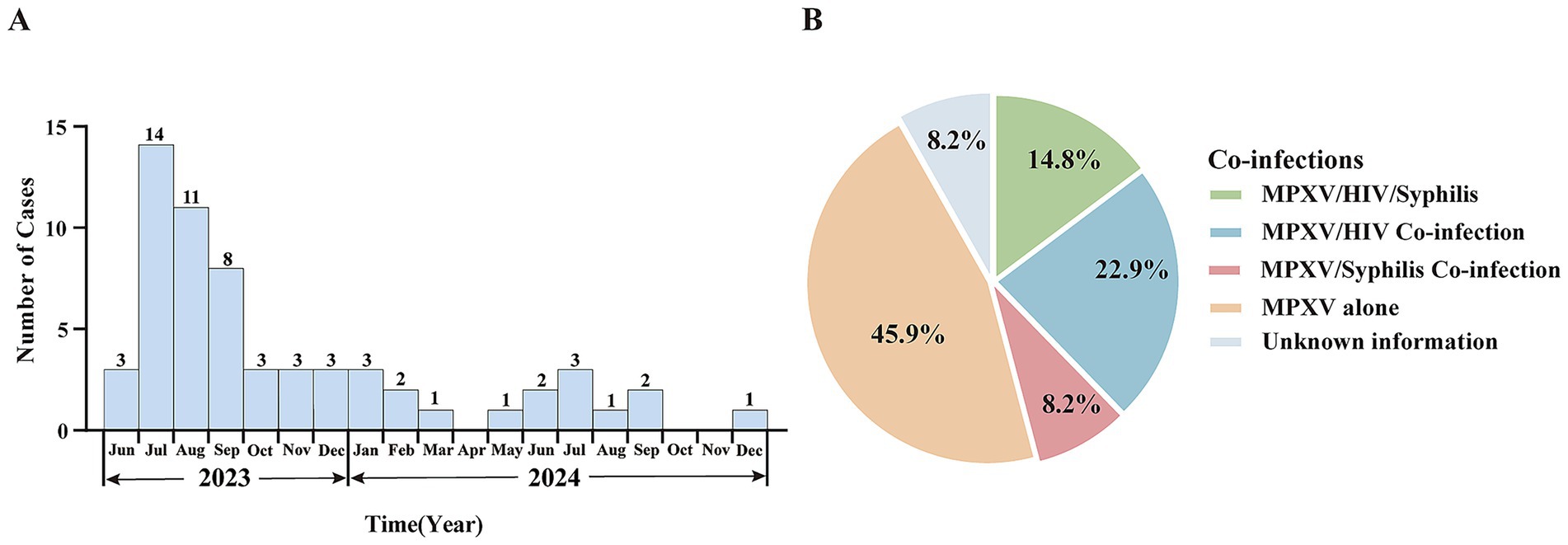 Figure 1. Epidemiological characteristics of confirmed Mpox cases in Shandong Province, June 2023 to December 2024. (A) Temporal distribution of reported Mpox cases in Shandong Province from 2023 to 2024. (B) Proportion of co-infections among confirmed Mpox cases.