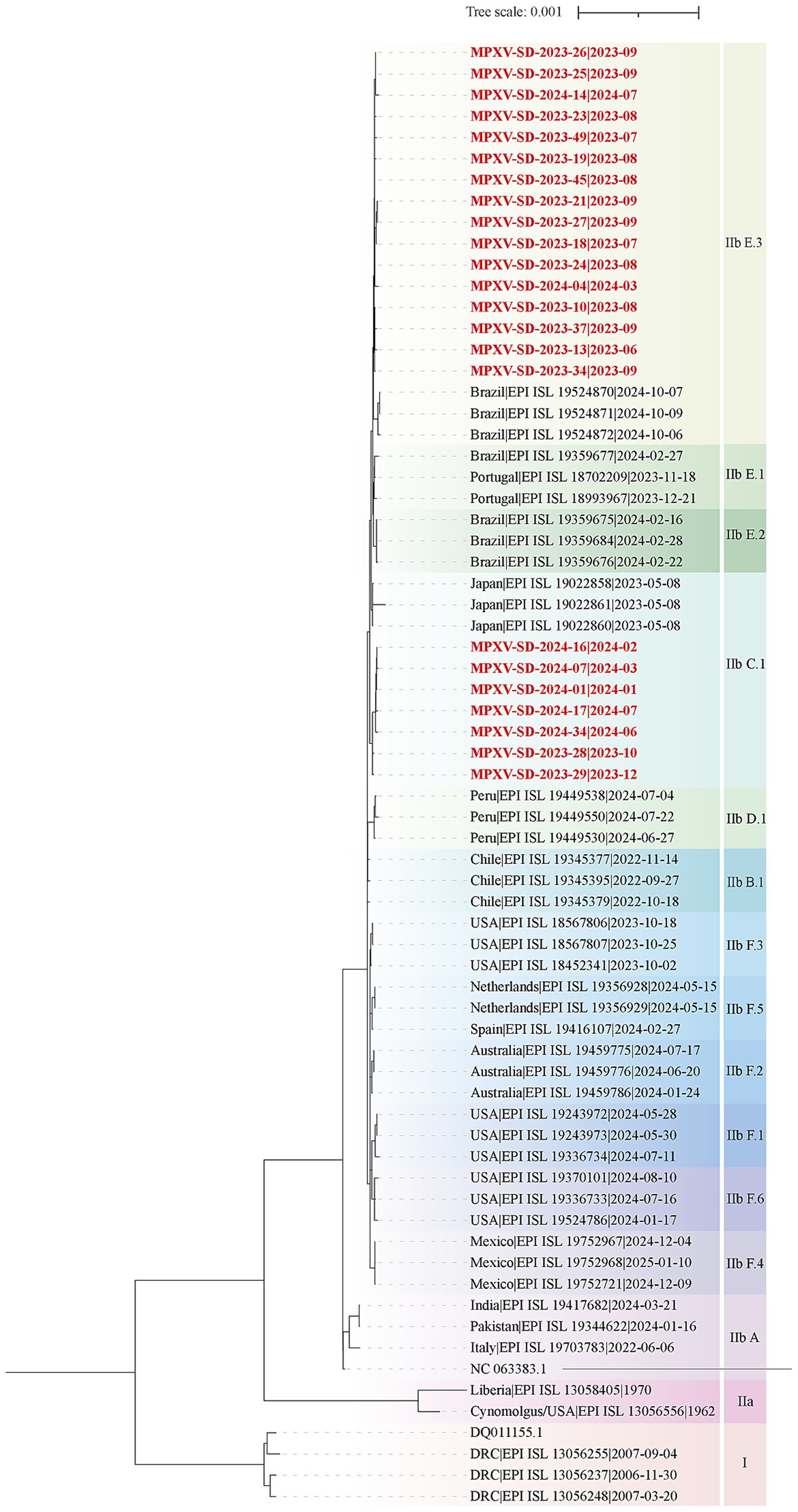 Figure 2. Phylogenomic analysis of MPXV Genomes from Shandong, 2023–2024. A maximum likelihood phylogenomic tree was constructed using whole-genome alignments of 23 MPXV sequences from Shandong and representative reference genomes from the GISAID database. Lineages are color-coded. The tree was rooted using Clade I as an outgroup. The scale bar represents the number of substitutions per site. Red labels denote MPXV sequences from Shandong in this study, while black labels indicate reference sequences from the GISAID database.