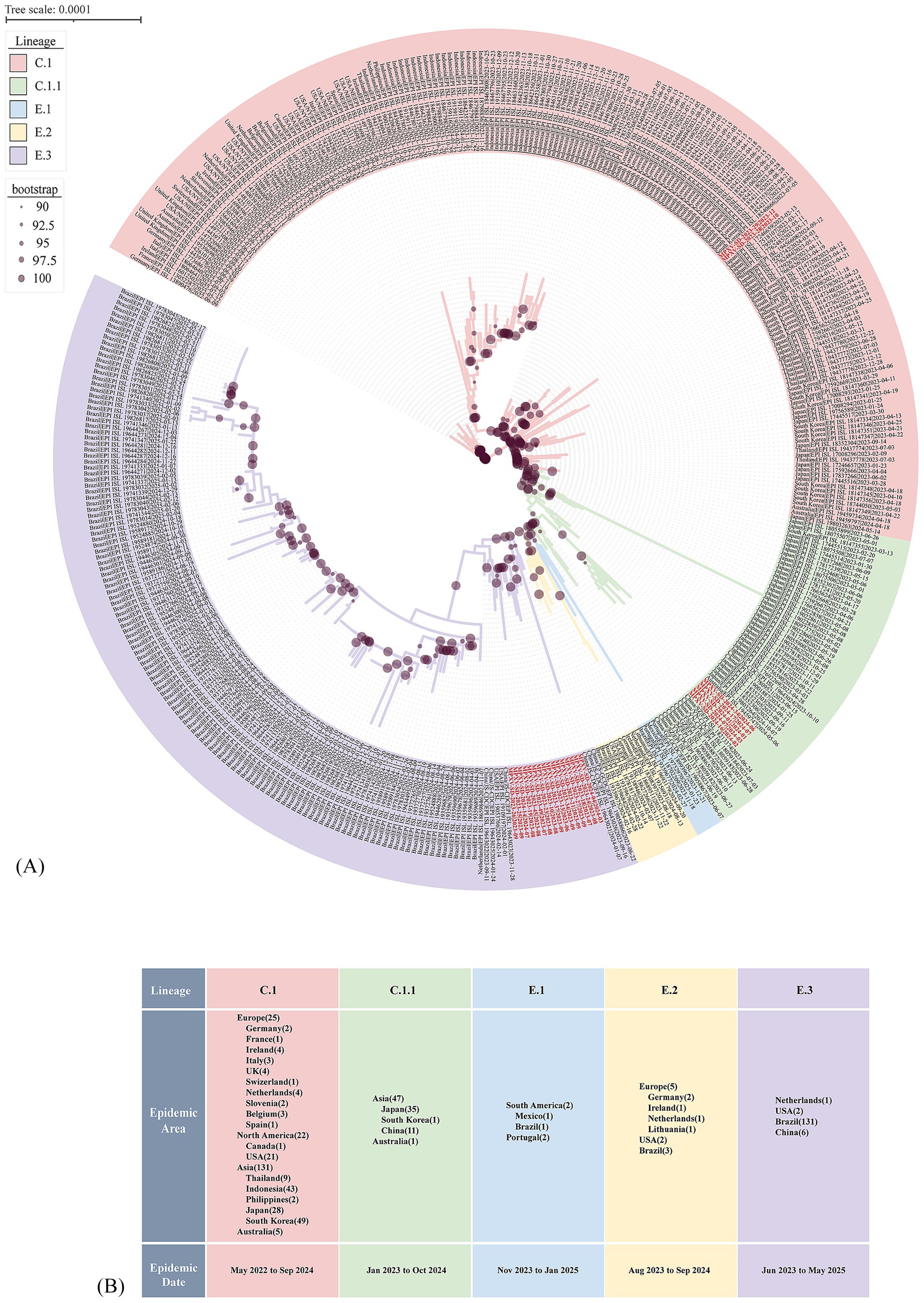 Lineage analysis based on the NextClade v3.13.2 online platform4 indicated that all 23 MPXV strains from Shandong belonged to lineage C.1. Subsequently, we retrieved genome sequences representing different subtypes within the C.1 lineage, including C.1, C.1.1, E.1, E.2, and E.3 from the GISAID database, using the following filter criteria: “complete,” “high coverage,” “low coverage excludes,” and “collection date complete.” After removing duplicate sequences, a total of 385 genomes were obtained including C.1 (n = 183), C.1.1 (n = 48), E.1 (n = 4), E.2 (n = 10), and E.3 (n = 140) sequences. These sequences, along with the 23 Shandong MPXV genomes, were used to construct a phylogenetic tree for the C.1 lineage. Multiple sequence alignment was performed using MAFFT version 7, and poorly conserved regions were trimmed using the trimAL Wrapper module in TBtools v2.225. The best-fit substitution model (HKY + F + I + R3) was determined using IQ-TREE v3.0.0, and a maximum likelihood phylogenetic tree was constructed. Node support was assessed using 1,000 ultrafast bootstrap replicates. The final tree was visualized using iTOL version 7.2.