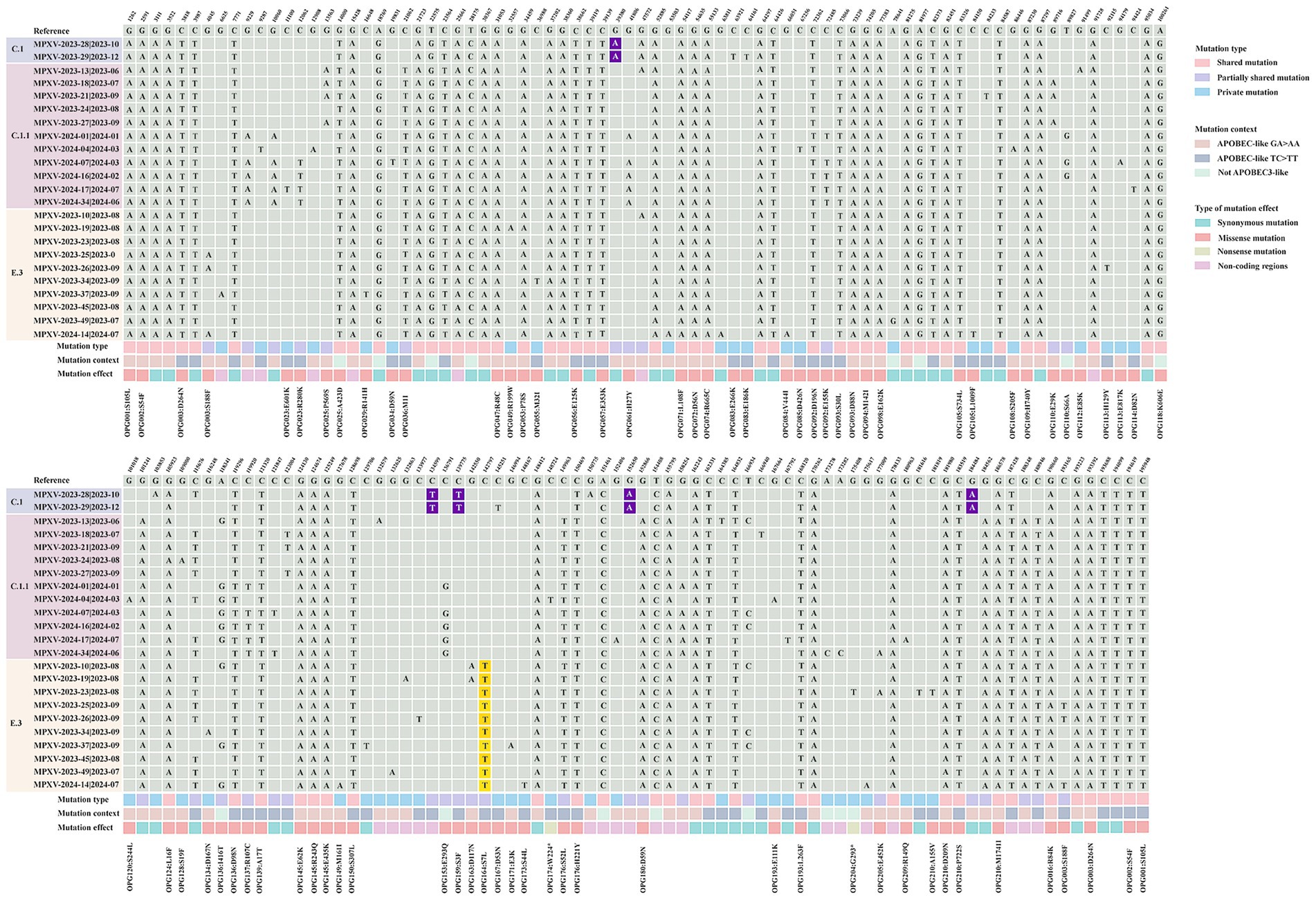 Figure 4. Comparison of local MPXV strains from Shandong (2023–2024) with the Clade II reference strain MPXV-M5312_HM12_Rivers (GenBank: NC_063383.1). A total of 157 distinct single nucleotide polymorphisms (SNPs) were identified in the Shandong MPXV genomes by alignment with the reference genome (GenBank: NC_063383.1). Mutations were categorized as shared, partially shared, or private based on their frequency across the 23 MPXV sequences. The “mutation context” refers to the nucleotide substitution pattern. Mutational effects were classified as synonymous, missense or nonsense according to their impact on the amino acid sequence of the encoded proteins. Nucleotides highlighted in purple indicate substitutions unique to the C.1 lineage, while those in yellow denote substitutions specific to the E.3 lineage.