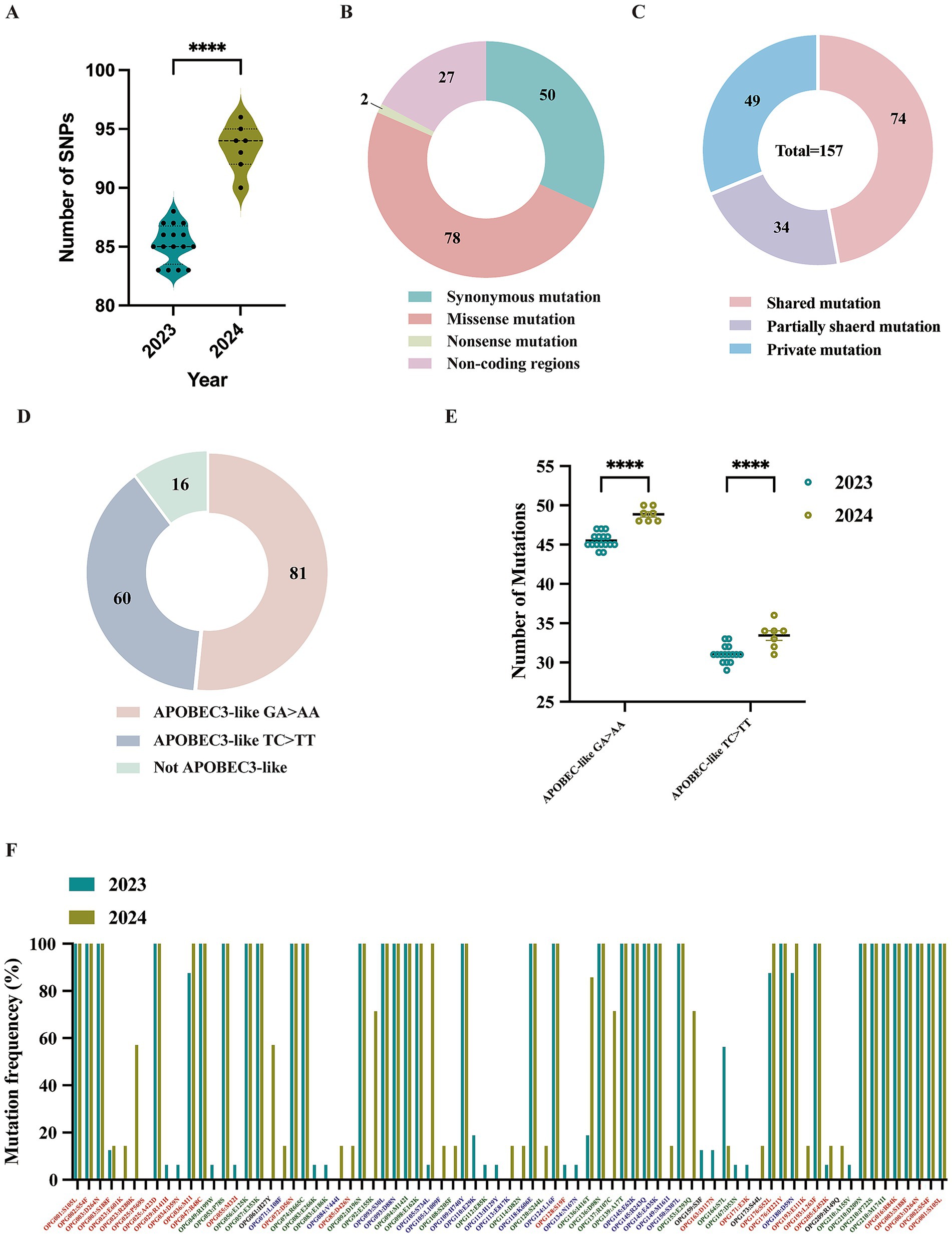 Figure 5. Analysis of molecular evolution characteristics of local MPXV strains from Shandong in 2023 and 2024. (A) Comparison of the number of SNPs among sequences between 2023 and 2024. (B) Types composition of mutations caused by 157 SNPs. (C) Distribution of mutation types for the 157 SNPs; (D) The nucleotide substitution distribution of the 157 SNPs. (E) A comparative analysis of GA > AA and TC > TT mutations in viral sequences collected in 2023 versus 2024. (F) Mutation frequency and protein annotation of 78 missense mutations identified in sequences from 2023 and 2024, respectively. Red labels indicate proteins involved in host interactions. Green labels denote viral surface proteins. Blue labels represent proteins associated with viral replication or transcription. Black labels refer to proteins of unknown function, as annotated in the reference MPXV genome (GenBank: NC_063383.1).
