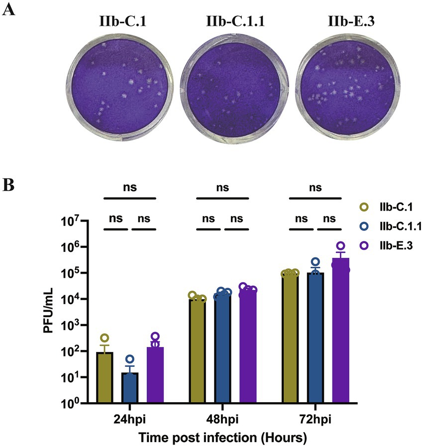Figure 6. Comparison of plaque morphology and replication kinetics of representative Monkeypox virus (MPXV) strains. (A) Plaque assays of three Clade IIb strains (SD-2023-28 [C.1], SD-2024-07 [C.1.1], SD-2024-14 [E.3]) on Vero E6 cells after three passages. Viral inocula were diluted to produce distinct and countable plaques. Images were captured on day 4 post-infection. The panel shows representative wells illustrating plaque morphology. (B) Multi-cycle growth curves showing viral titers at indicated timepoints post-infection. Data represent mean ± SEM from two independent experiments, each with two repeats. Differences in viral replication among isolates across time points were analyzed using two-way ANOVA.
